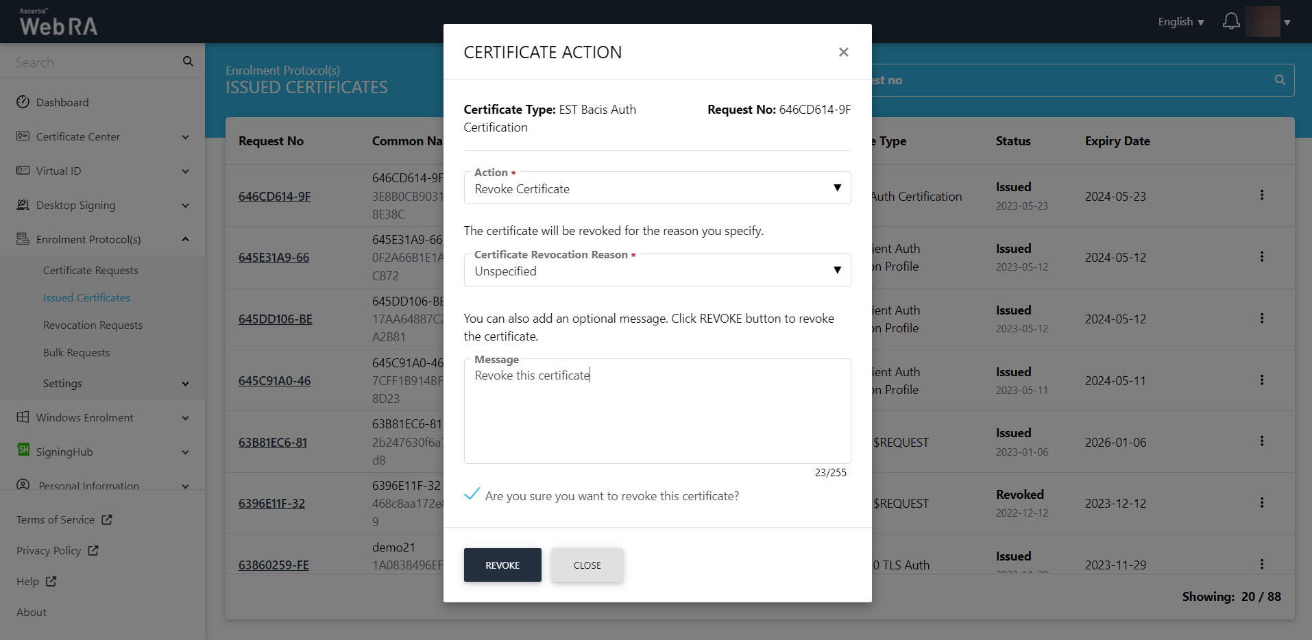 - Certificate action screen will be displayed. Select "Revoke Certificate" from the drop down, select a reason for revocation, tick the confirmation checkbox and then click "Revoke".
