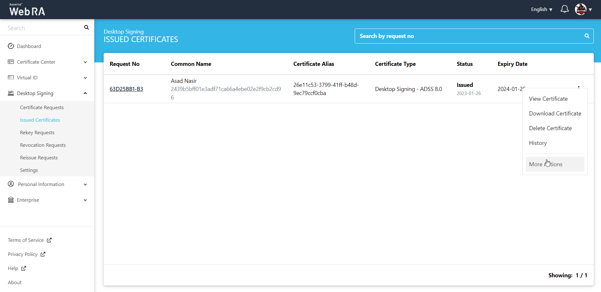 2. Click the button against the certificate that you want to revoke and click on "More Actions".