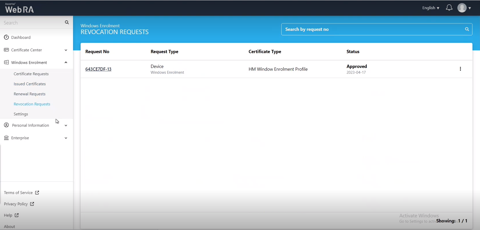 This section lists all the certificate revocation requests pertaining to Windows enrolment. The process of certificate revocation will be similar to revocating other certificate requests i.e. Desktop Signing, Virtual ID, etc. Following is a screenshot of all revocation requests pertaining to Windows enrolment: