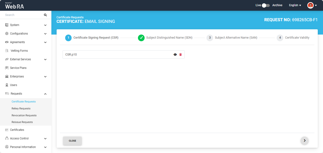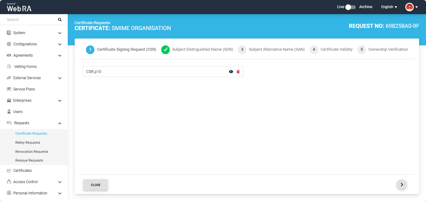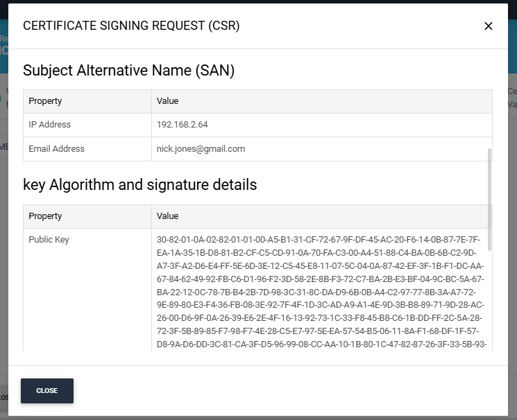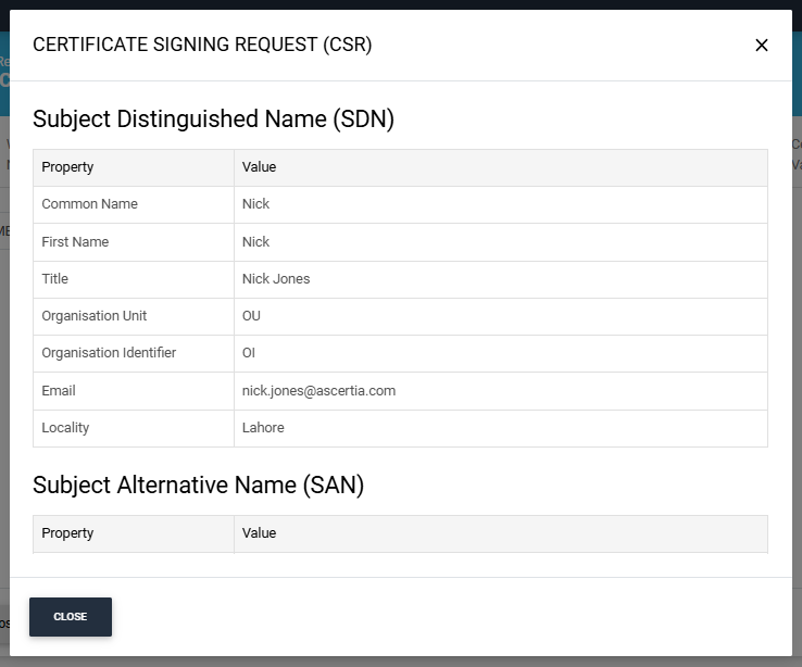 Once the CSR is uploaded, it will appear in the CSR field. You can view the details of the CSR by clicking the Eye icon. It contains all the SDNs, SANs, etc.