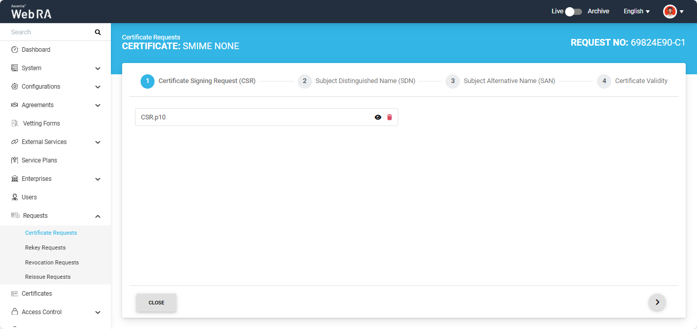 Once the CSR is uploaded, it will appear in the CSR field. You can view the details of the CSR by clicking the Eye icon.