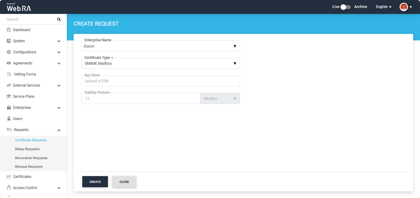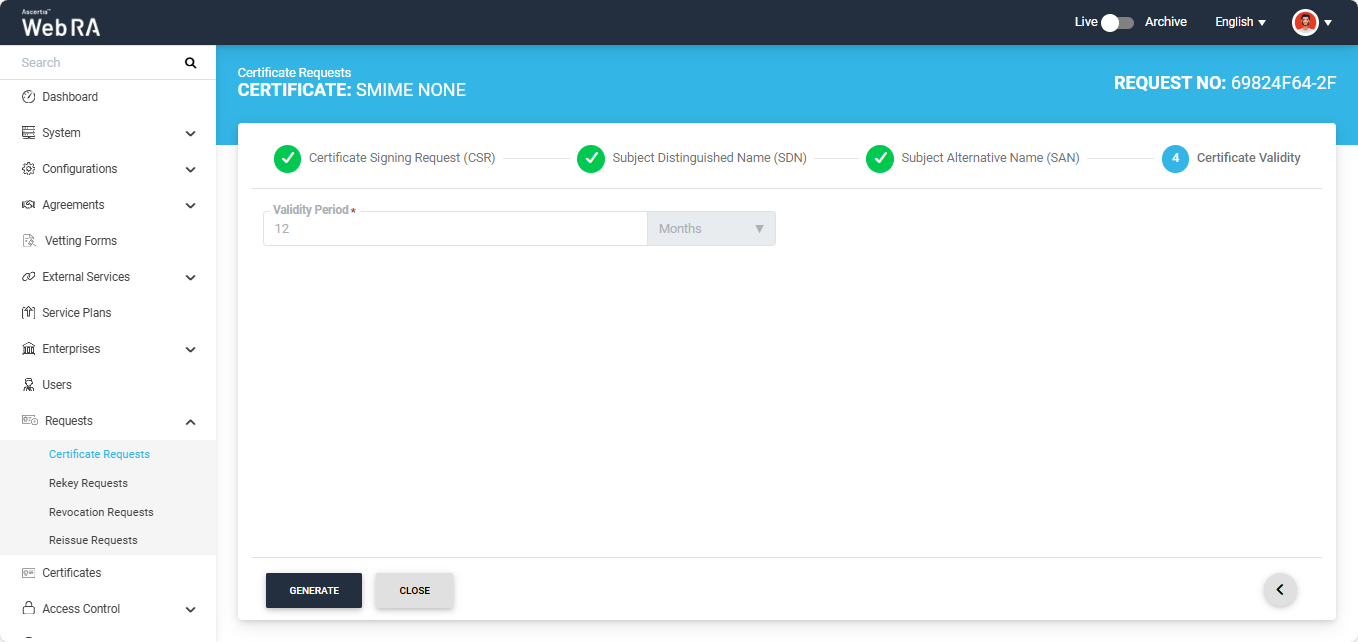 This section explains how to create certificate requests for S/MIME Certificate type in the Web RA application.