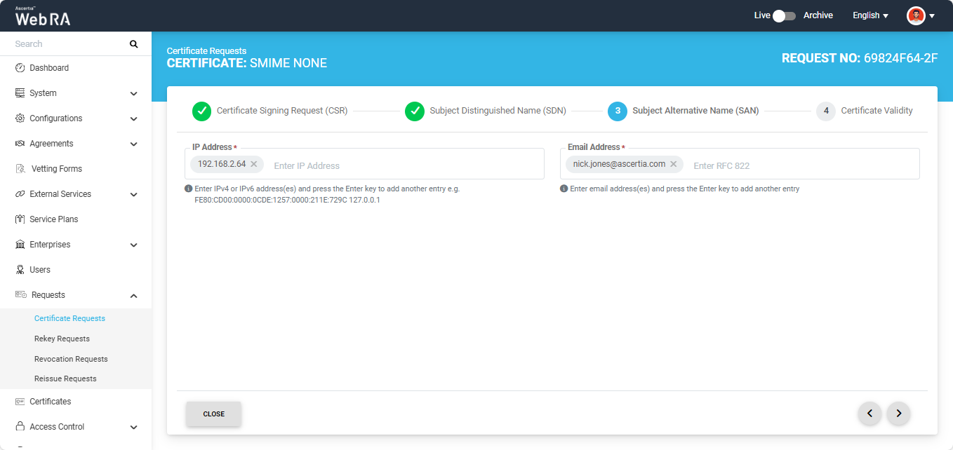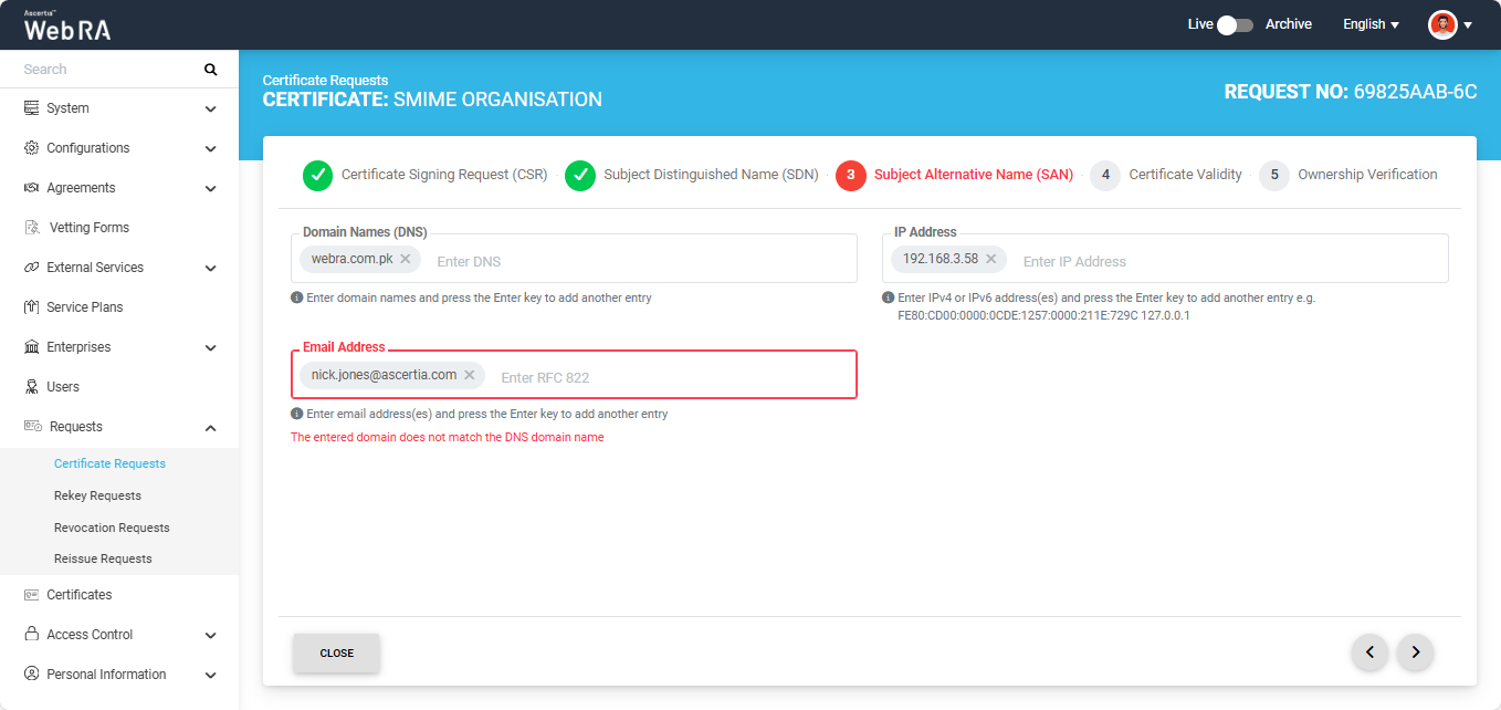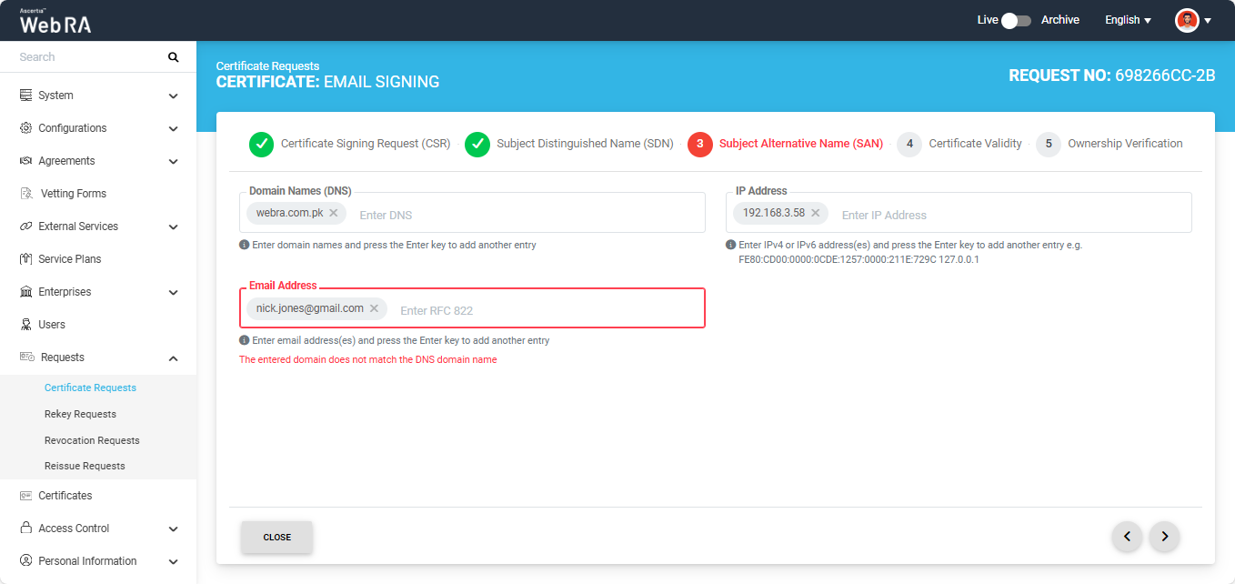 Note: If the Domain Names (DNS) field is present in the SAN, ensure that the domain in the DNS and Email Address fields are the same. If the domains differ, the system displays an error and does not allow you to proceed.