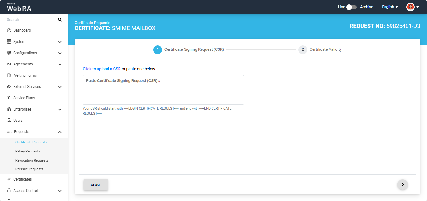 The system will display the Certificate Signing Request (CSR) screen. Here, you can either upload a CSR or paste it into the ‘Paste Certificate Signing Request (CSR)’ box.