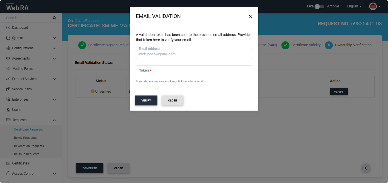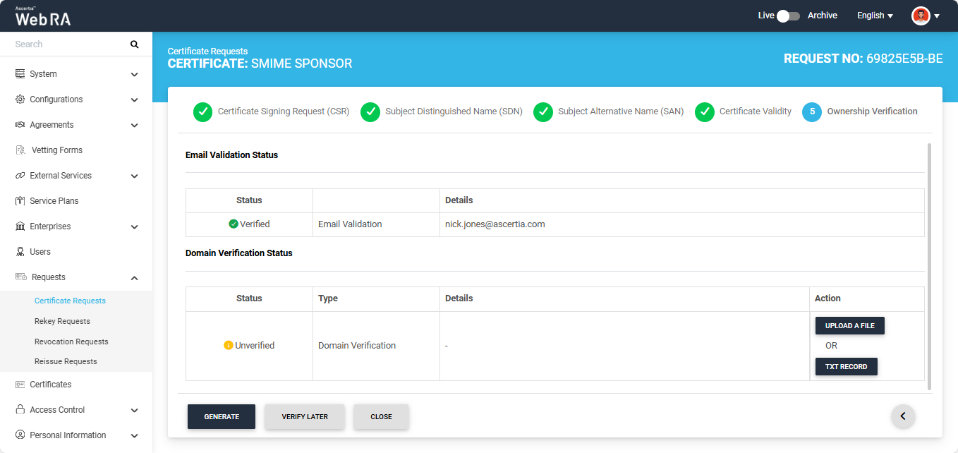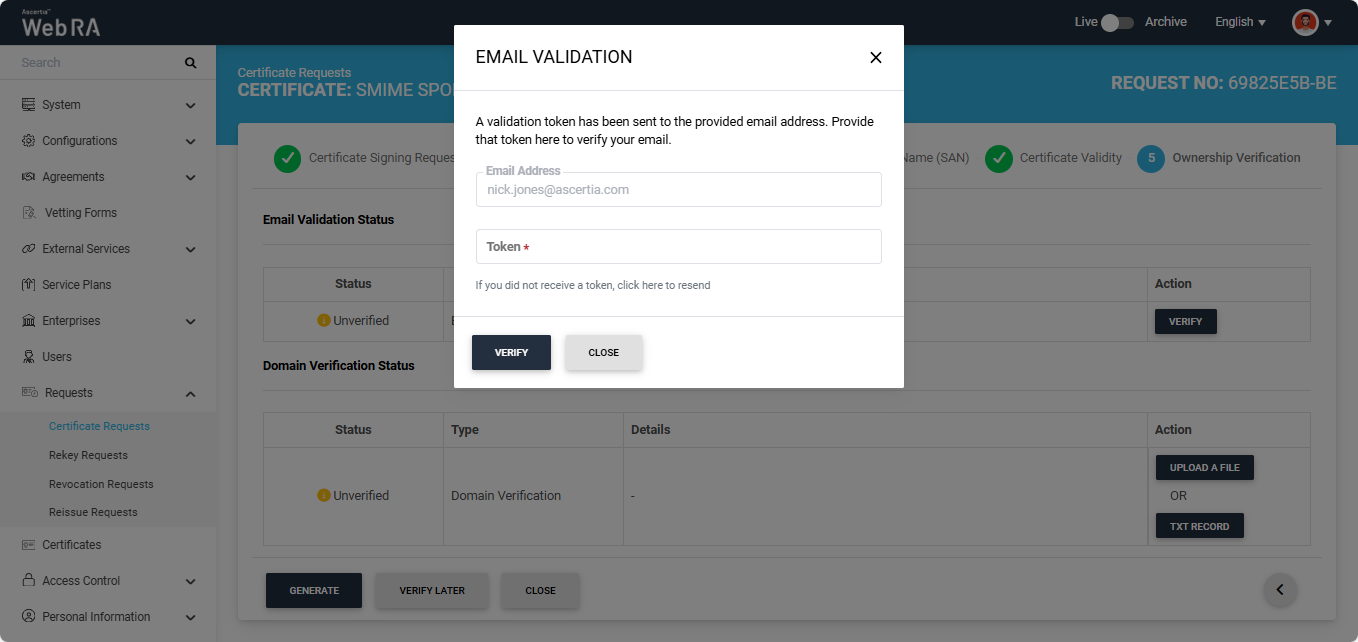 Click the next '>' button to navigate to the 'Ownership Verification' screen. The system will display the Email Validation and the Domain Verification sections on the screen. If the ‘Sponsor’ validation type is configured in the certification profile, the ownership verification screen will require you to complete both verifications before generating the certificate.