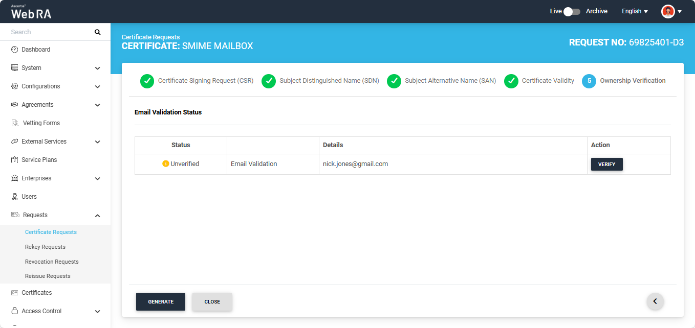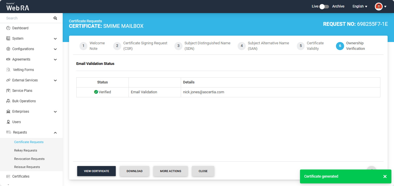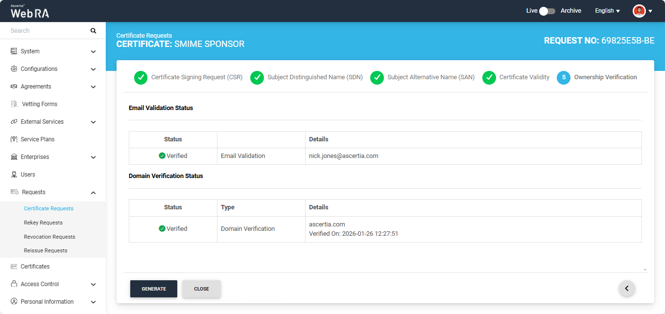 After the verification is complete you can click the generate button to create the certificate.