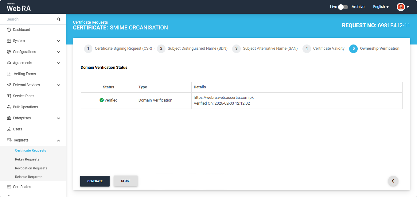 After successful verification, click the ‘Generate’ button to create the certificate. The system will create the certificate and display the 'Certificate generated' alert on the screen.