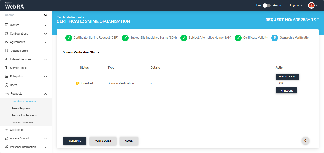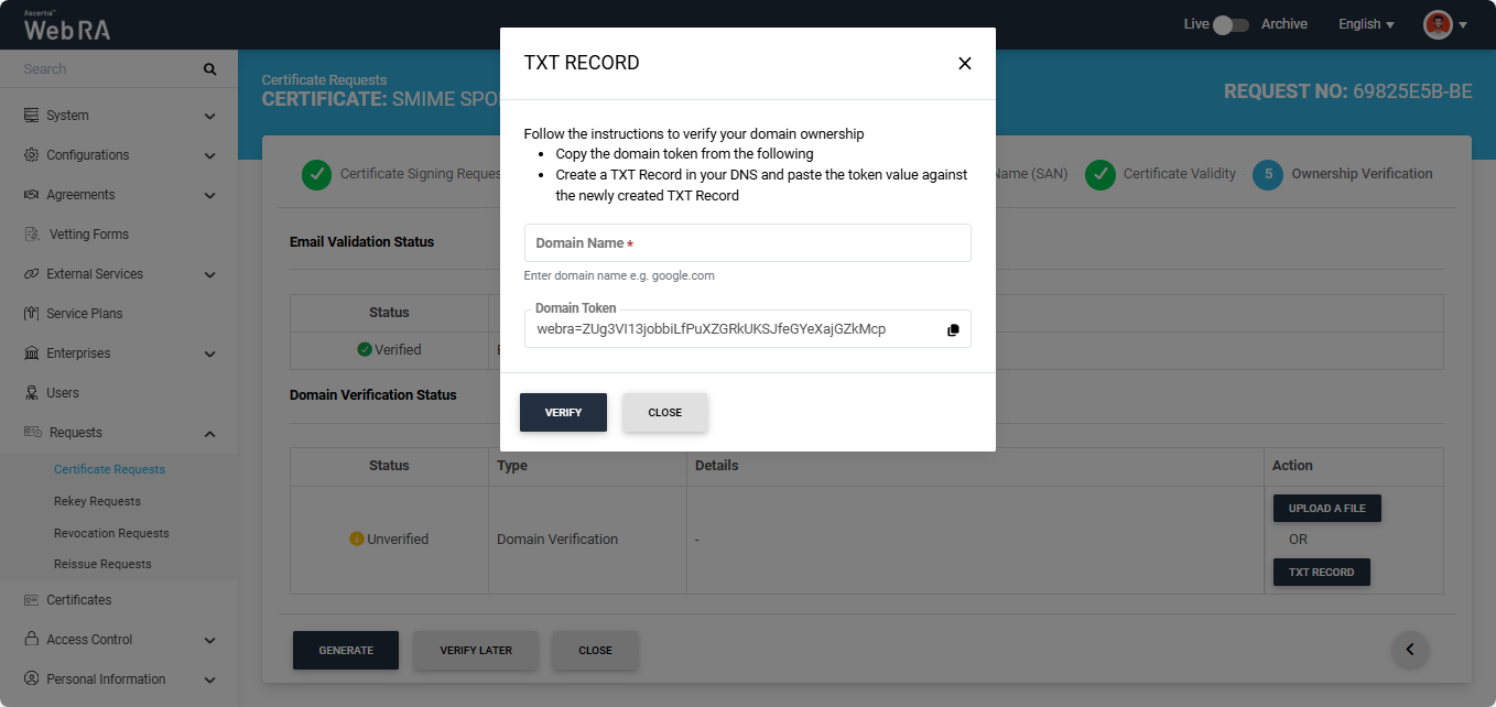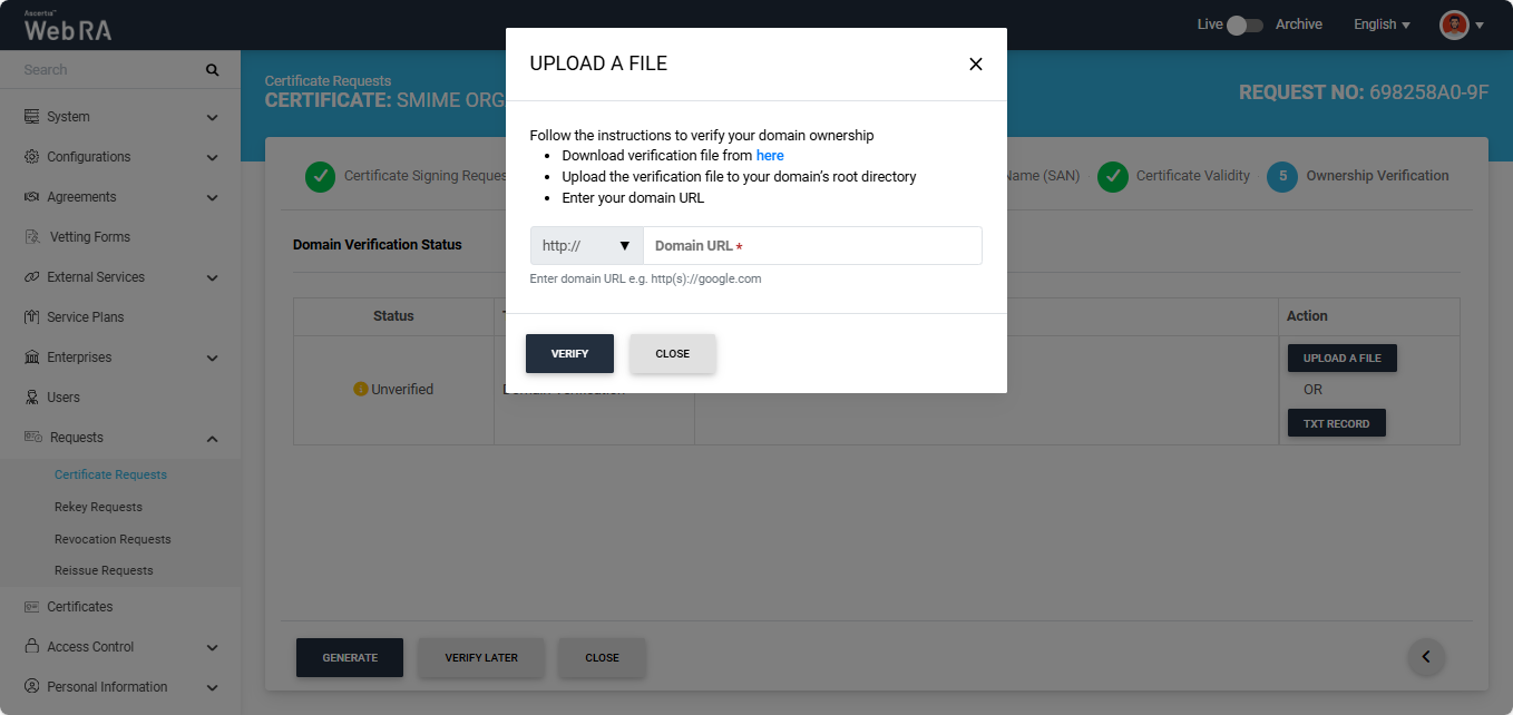 Note: The action (Upload a File or TXT Record) through which domain verification can be performed is configured in the certification profile. The operator may select one or both methods for domain verification. You can use any of the method to verify your domain. For more details about how the method is selected, navigate to the ‘Certification Profiles’ section.