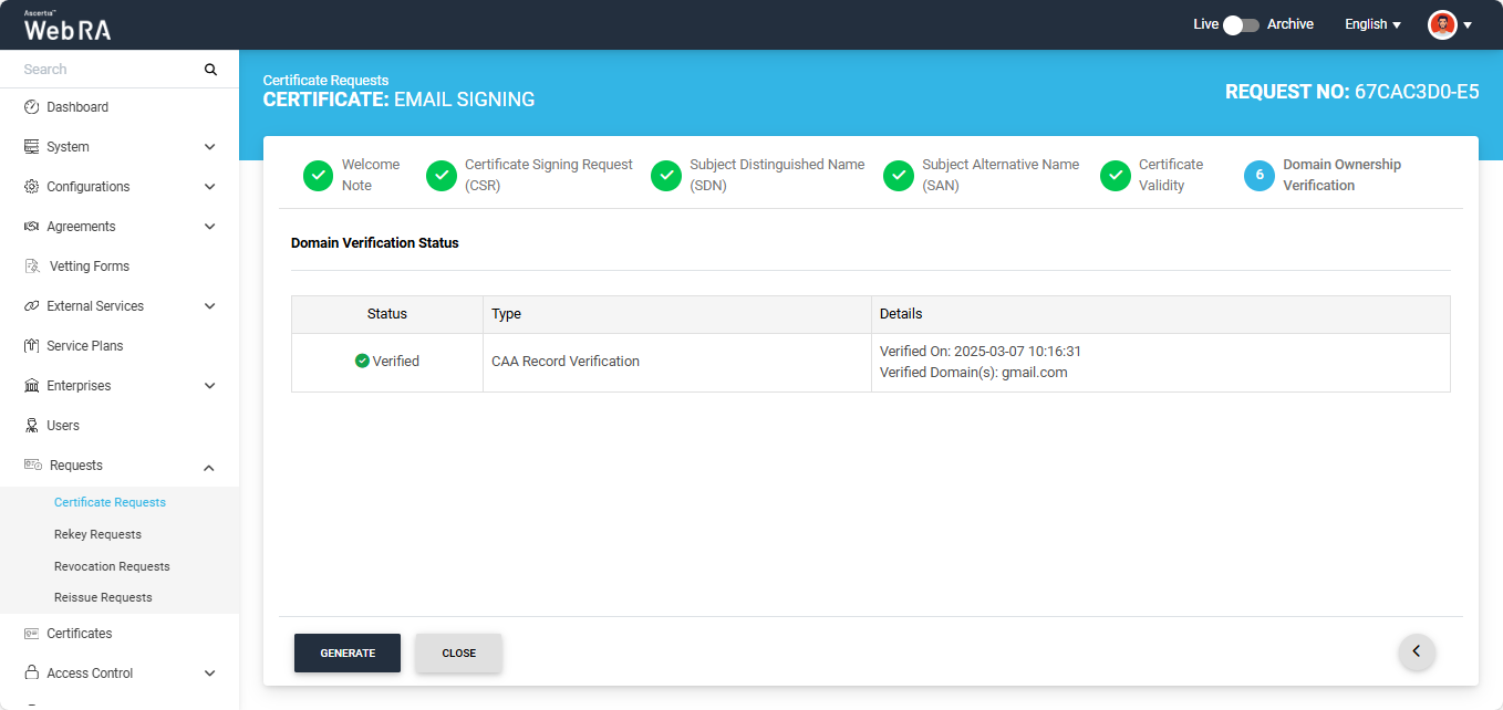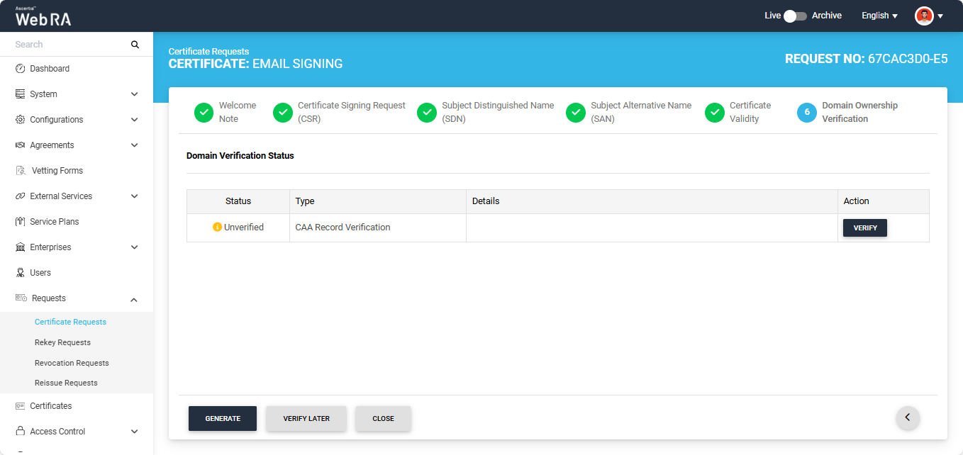Note: If Certification Authority Authorisation (CAA) Records is enabled in the Enterprise Domain Settings, CAA record verification is required in the Ownership Verification section. When CAA record verification is enabled and the Organisation validation type is selected, the system performs both domain verification and CAA record verification before generating the certificate. Ensure that the domain in the DNS and Email Address fields of the SAN are the same. If they differ, the system displays an error on the SAN screen and does not allow you to proceed. For more details, see how CAA Record Verification is performed.