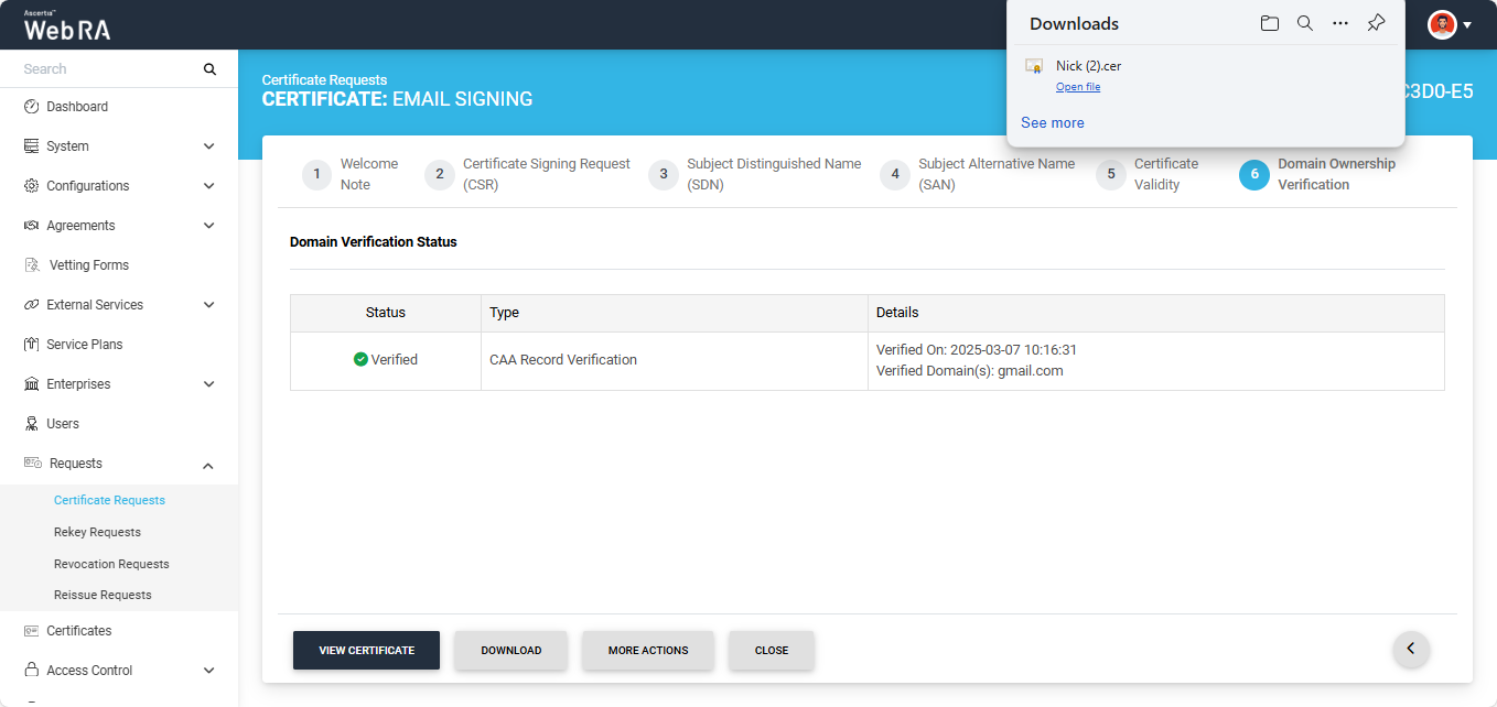 If the CAA records configured in the Enterprise Domain configurations match the domain of the entered email, the Domain Verification Status will appear as Verified, as displayed below.