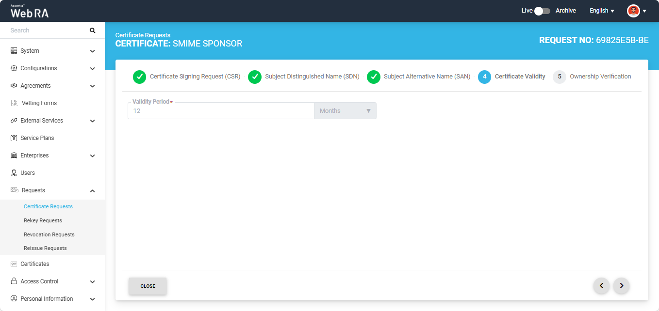 The following steps describe how to create an S/MIME certificate request with the Sponsor validation type.