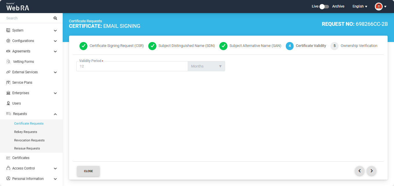 Expand Requests > Certificate Requests from the Admin portal to navigate to the Certificate Requests listing screen.