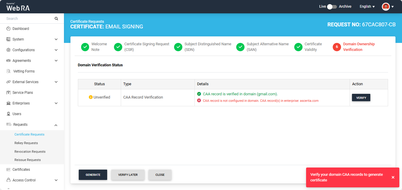 If you attempt to generate the certificate while the Domain Verification Status is ‘Unverified,’ the system will display an error dialog prompting you to verify your domain’s CAA records before proceeding.