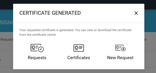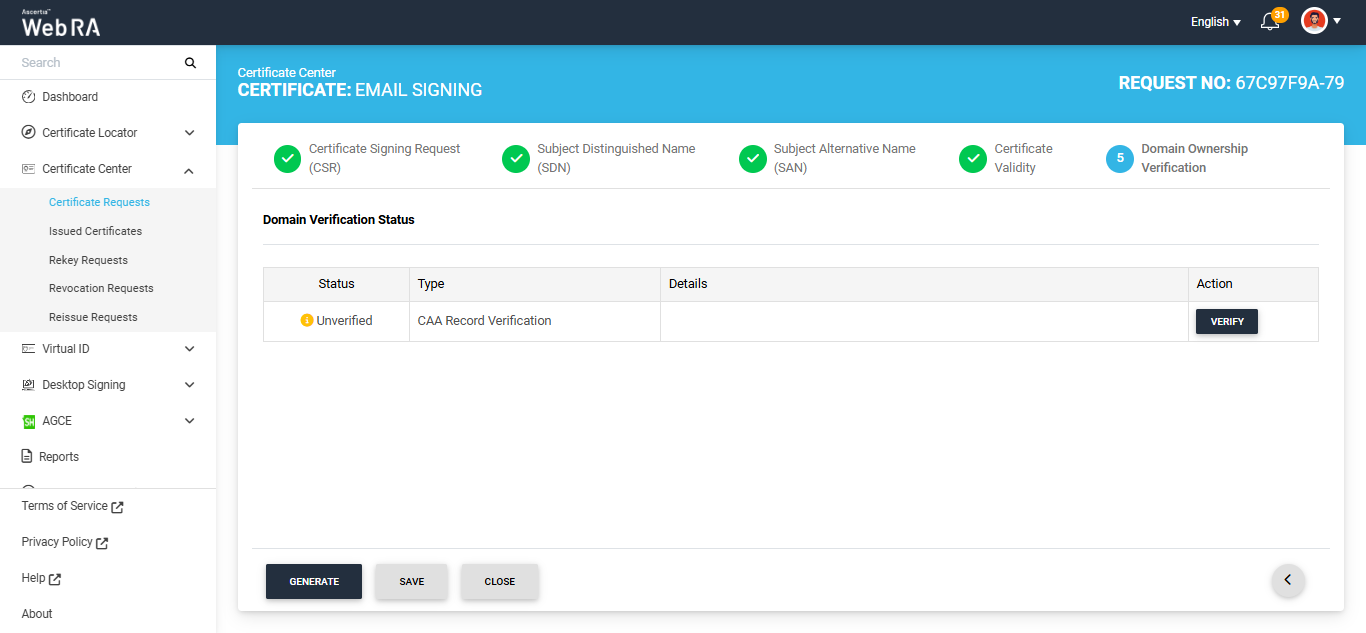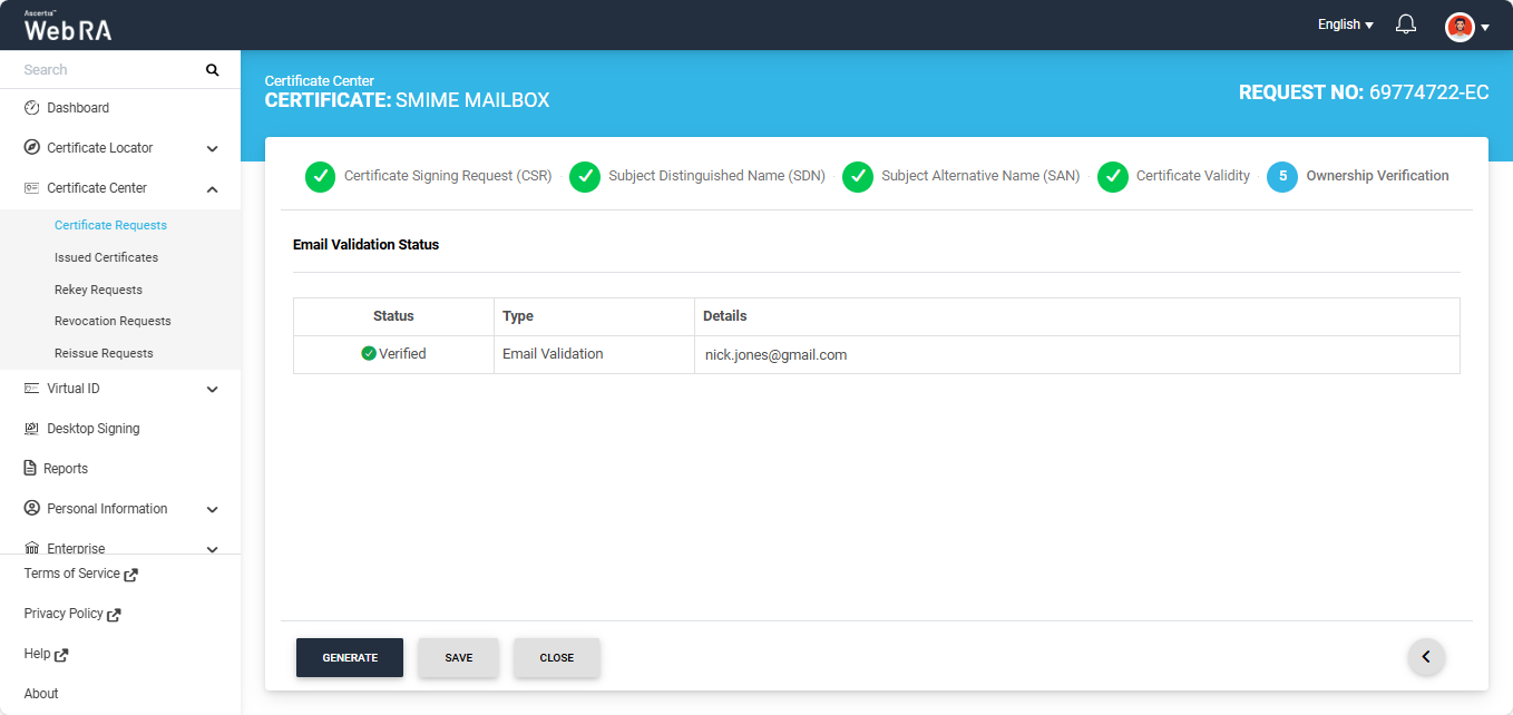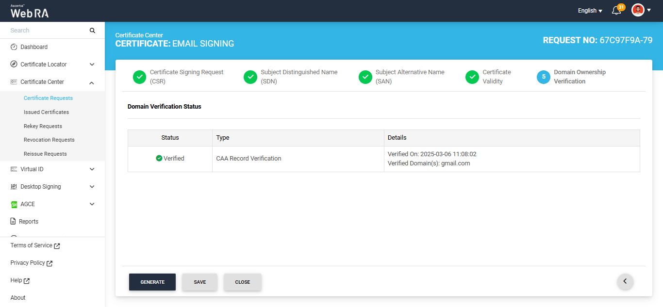 In case of Verified status, click Generate to process a certificate. The Certificate Generated confirmation message will appear, as displayed below: