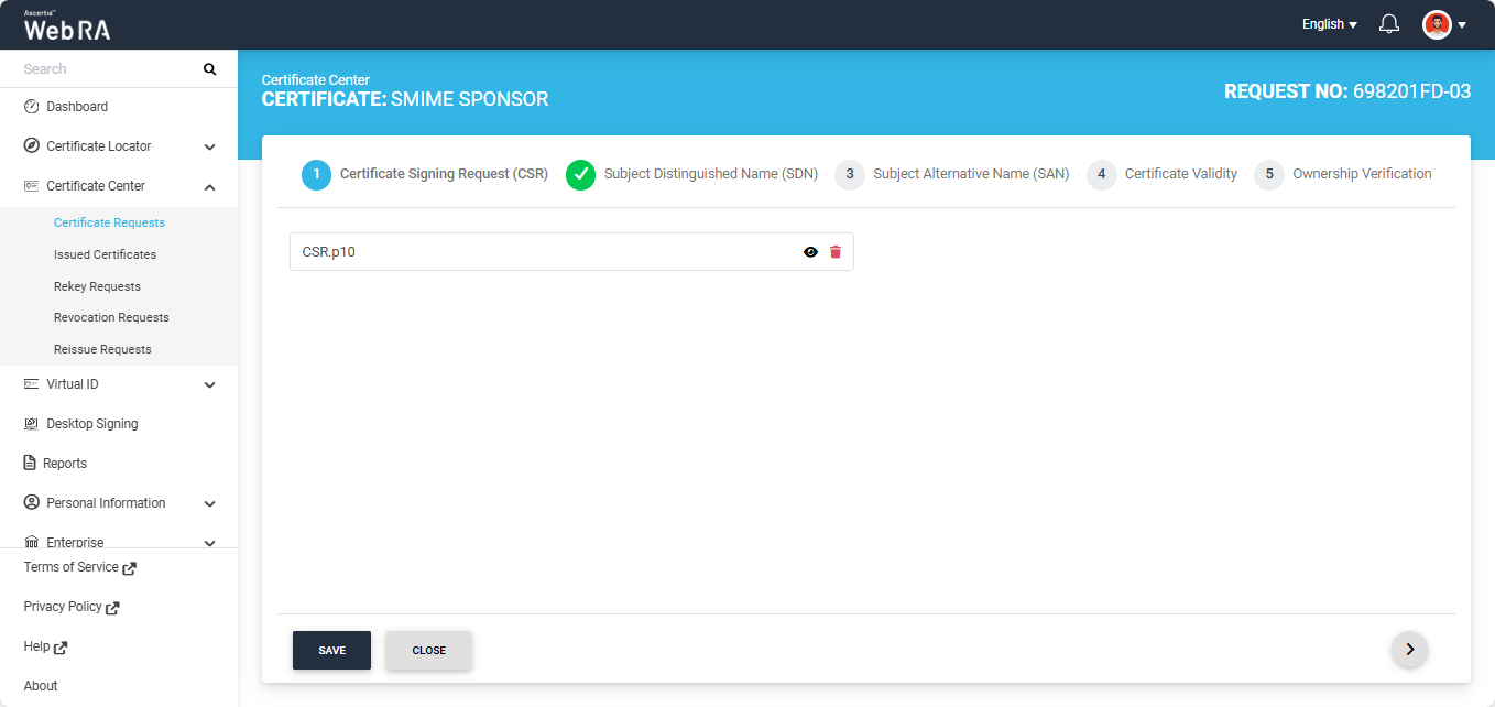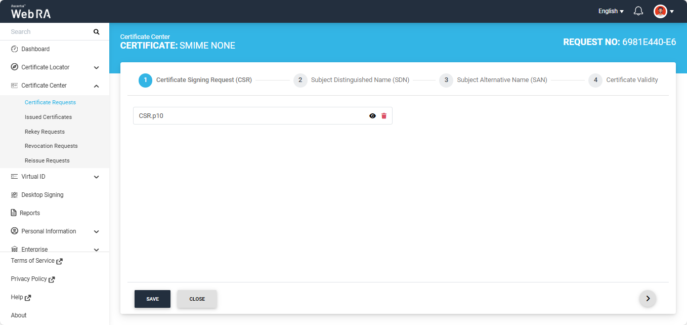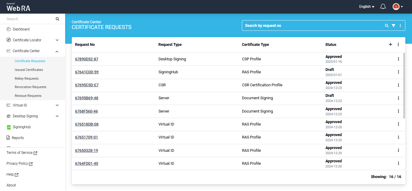 Expand Certificate Center > Certificate Requests to navigate to the Certificate Requests listing screen.