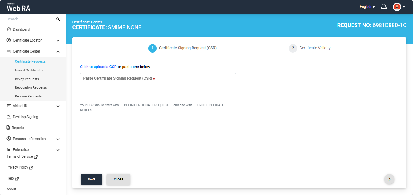 The system will display the Certificate Signing Request (CSR) screen. Here, you can either upload a CSR or paste it into the ‘Paste Certificate Signing Request (CSR)’ box.