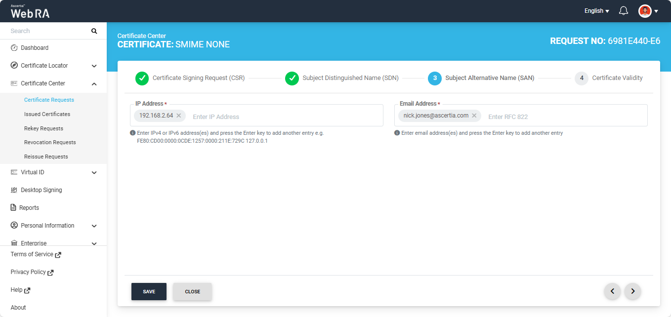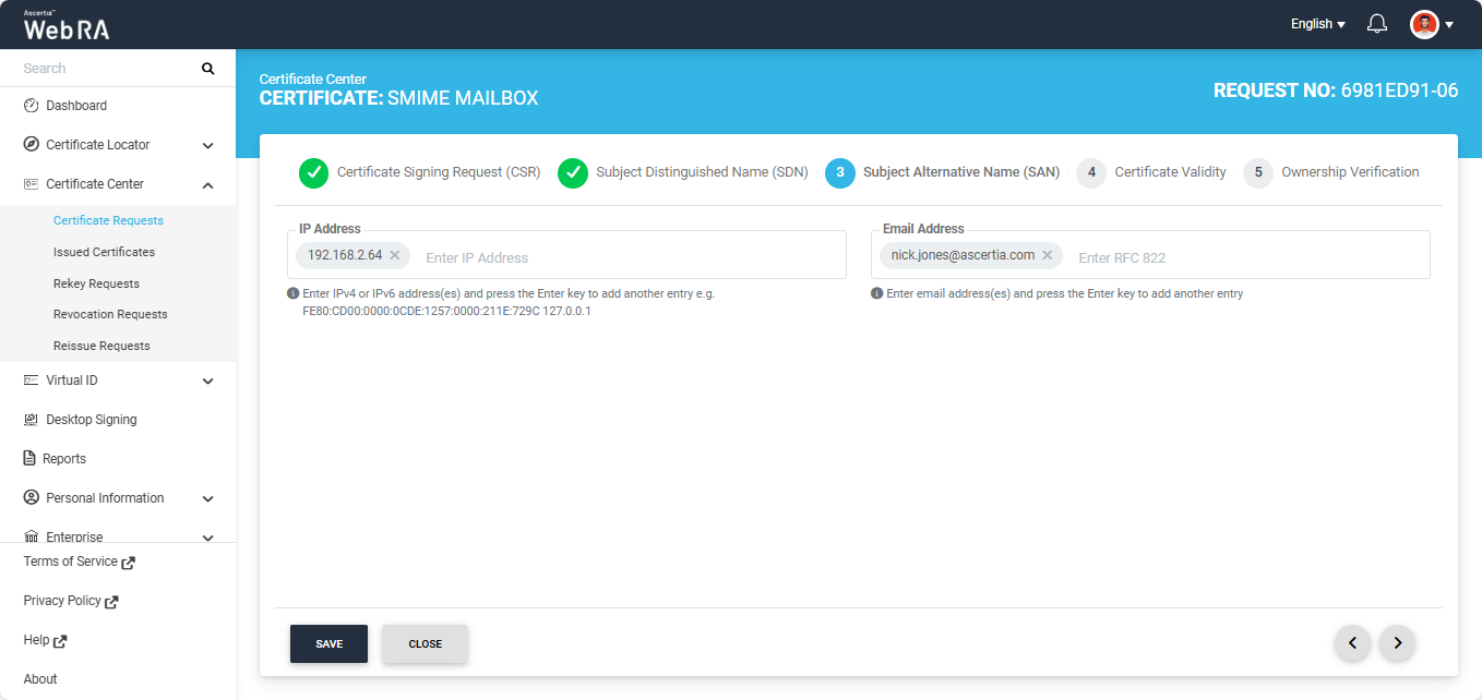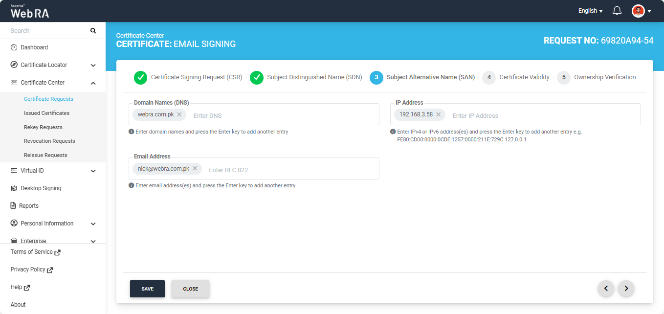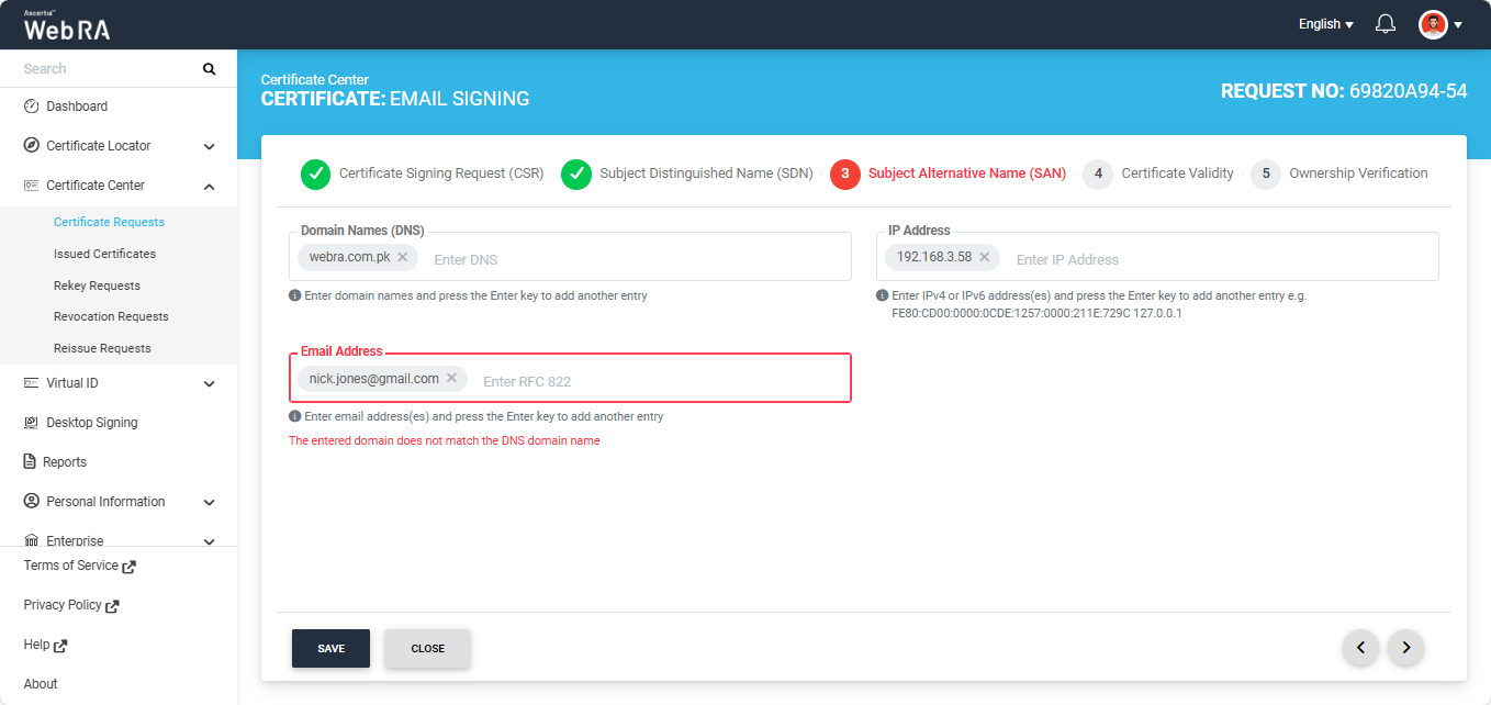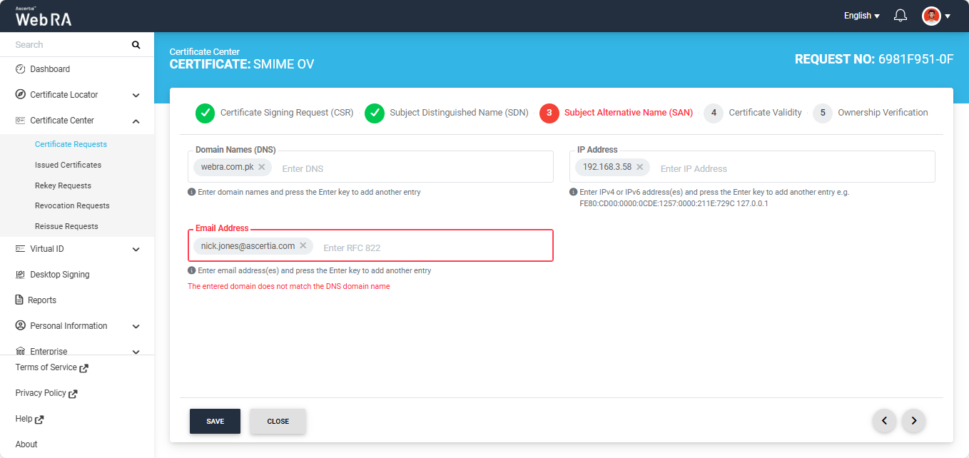 Note: If the Domain Names (DNS) field is present in the SAN, ensure that the domain in the DNS and Email Address fields are the same. If the domains differ, the system displays an error and does not allow you to proceed.