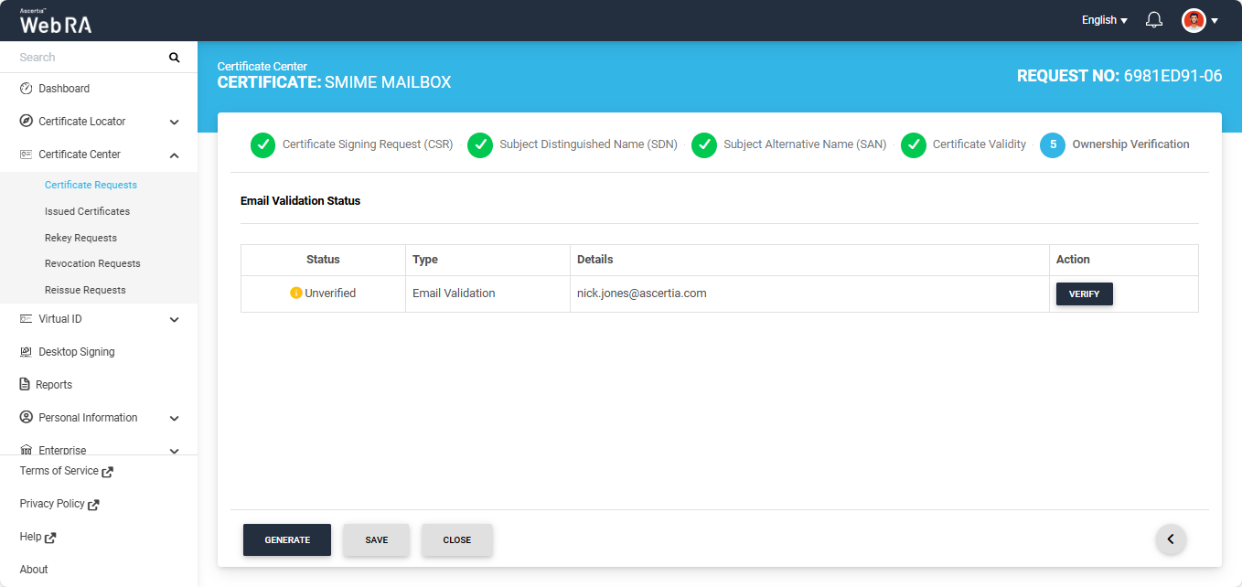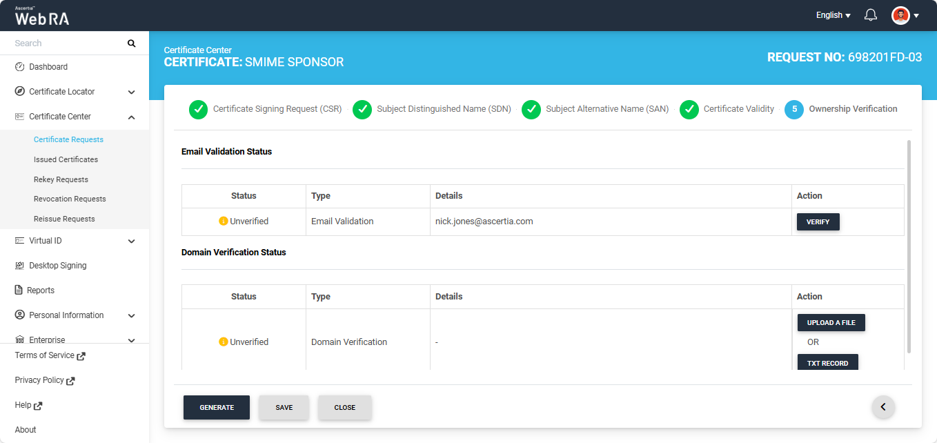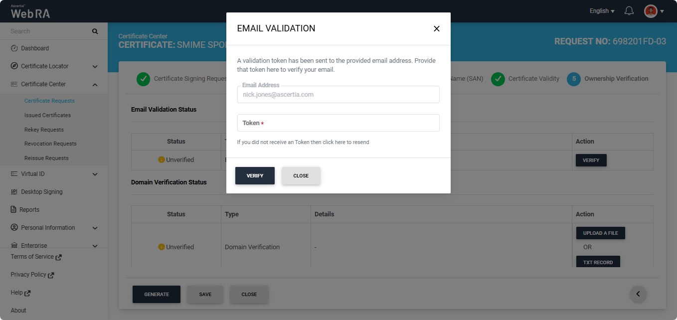 Click the next '>' button to navigate to the 'Ownership Verification' screen. The system will display the Email Validation and the Domain Verification sections on the screen. If the ‘Sponsor’ validation type is configured in the certification profile, the ownership verification screen will require you to complete both verifications before generating the certificate.
