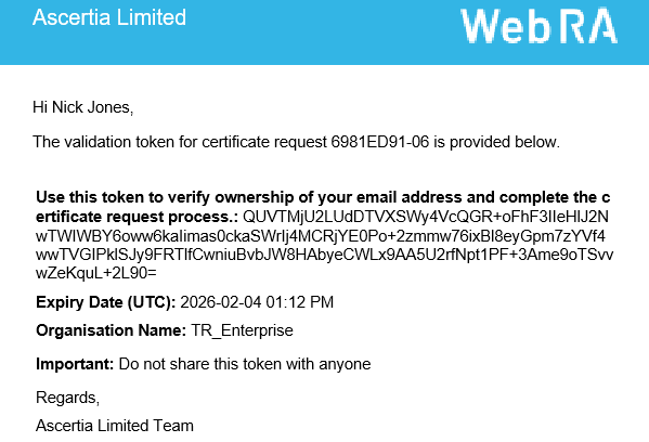 For domain verification, the system extracts the organisation domain from the email address in the RFC822Name field. If the Domain Names (DNS) field is present in the SAN, the system matches the domain in the DNS field with the domain in the RFC822Name field. The system will match the domain in the SAN section, as mentioned in the steps above.