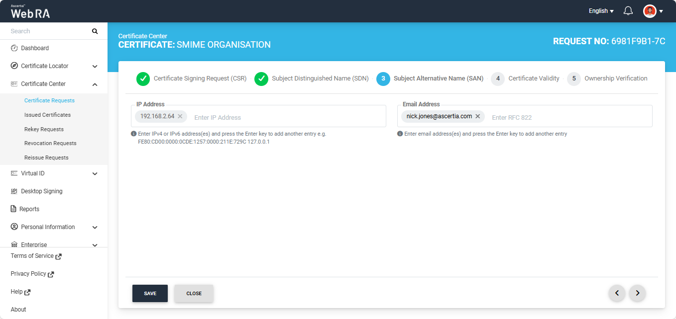 Note: If Certification Authority Authorisation (CAA) Records is enabled in the Enterprise Domain Settings, CAA record verification is required in the Ownership Verification section. When CAA record verification is enabled and the Organisation validation type is selected, the system performs both domain verification and CAA record verification before generating the certificate. Ensure that the domain in the DNS and Email Address fields of the SAN are the same. If they differ, the system displays an error on the SAN screen and does not allow you to proceed. For more details, see how CAA Record Verification is performed.