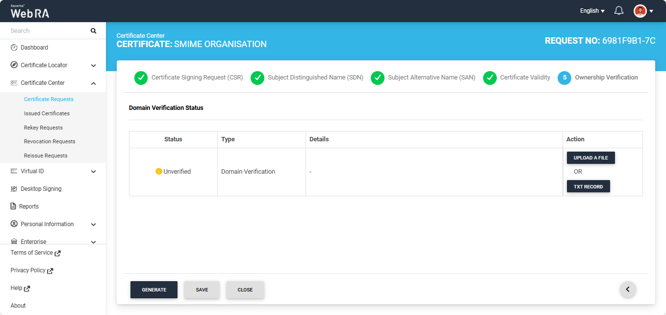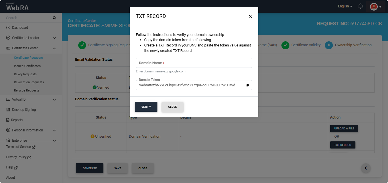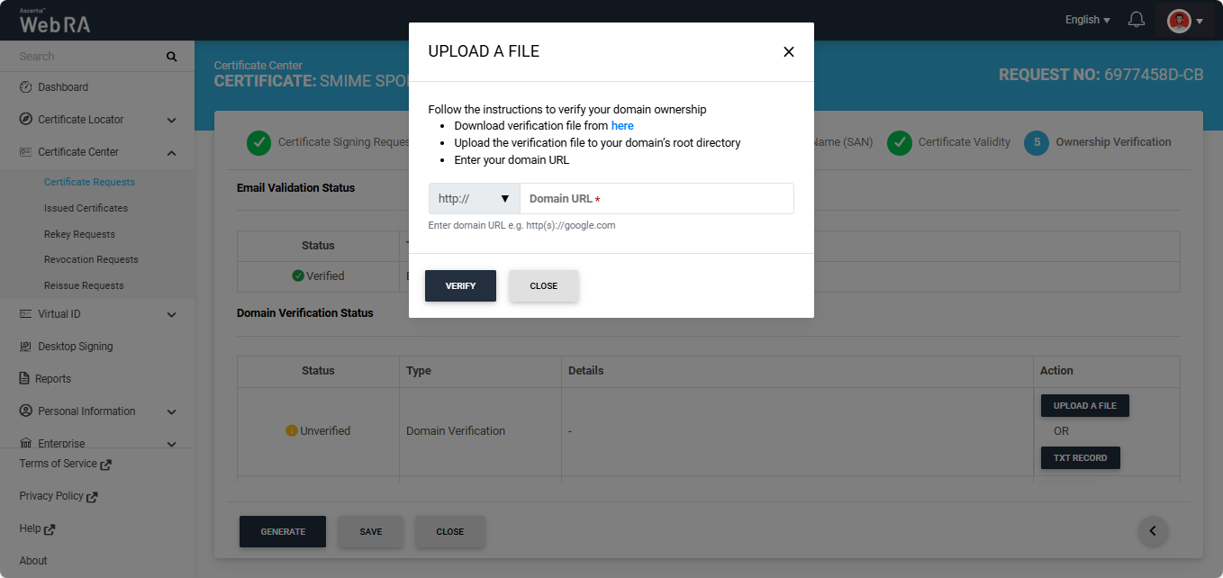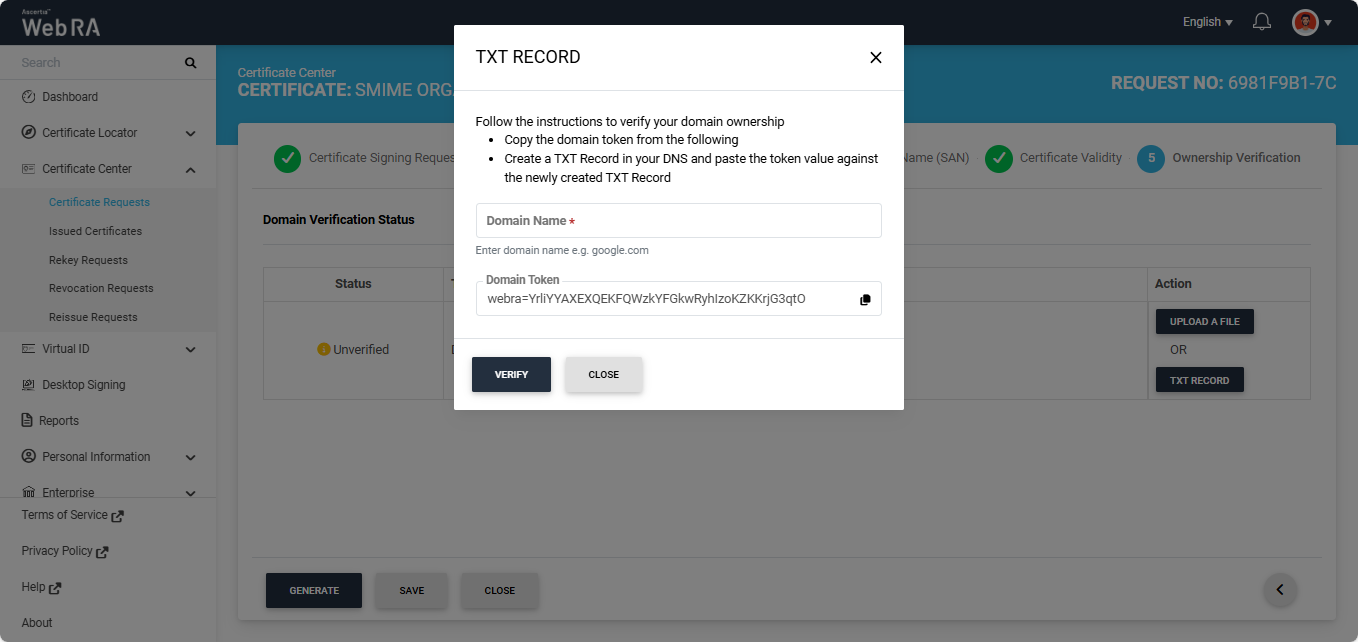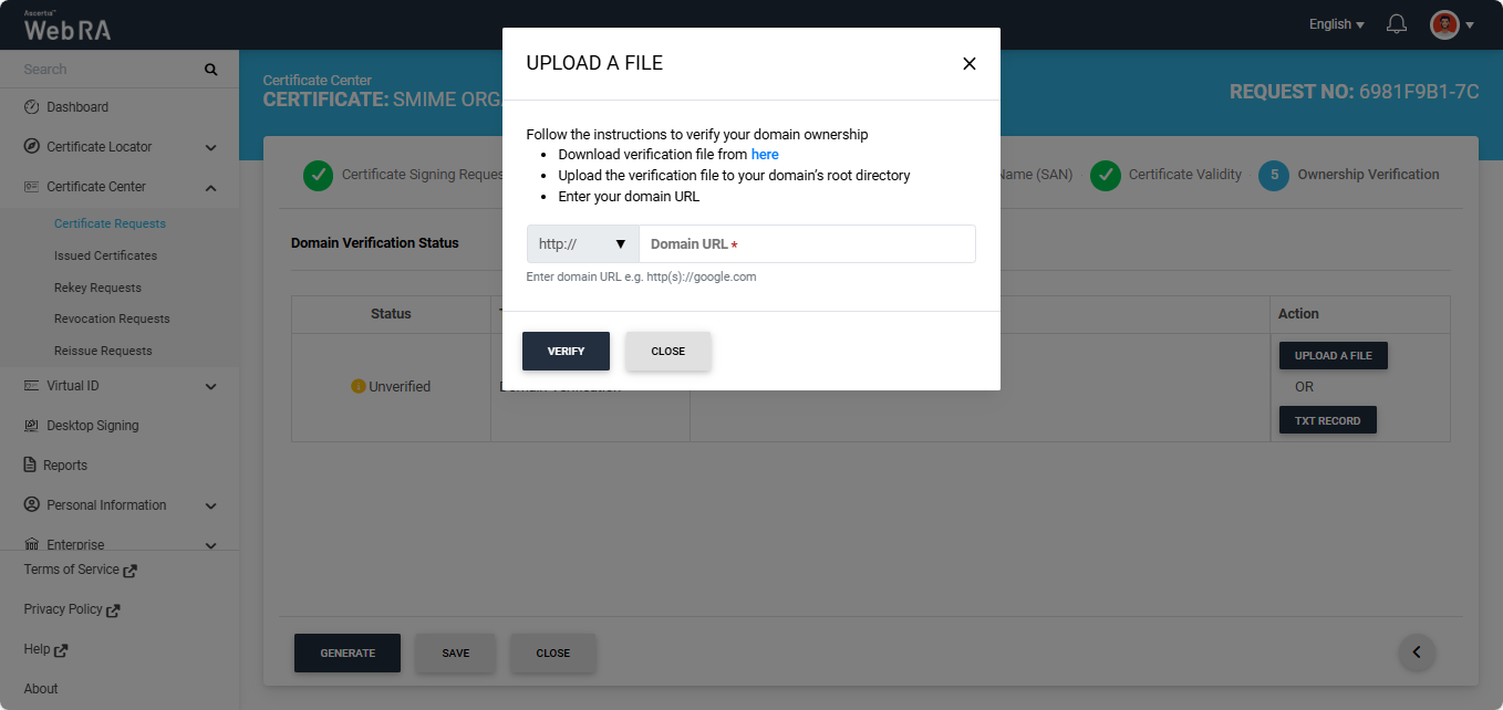 Note: The action (Upload a File or TXT Record) through which domain verification can be performed is configured in the certification profile. The operator may select one or both methods for domain verification. You can use any of the method to verify your domain. For more details about how the method is selected, navigate to the ‘Certification Profiles’ section.
