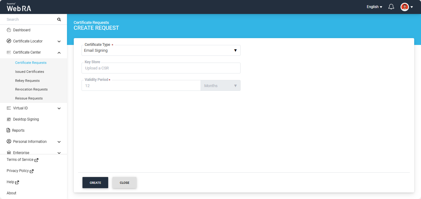 The create request screen will appear. On this screen, select the required ‘Certificate Type’ from the dropdown, and click ‘Create’.