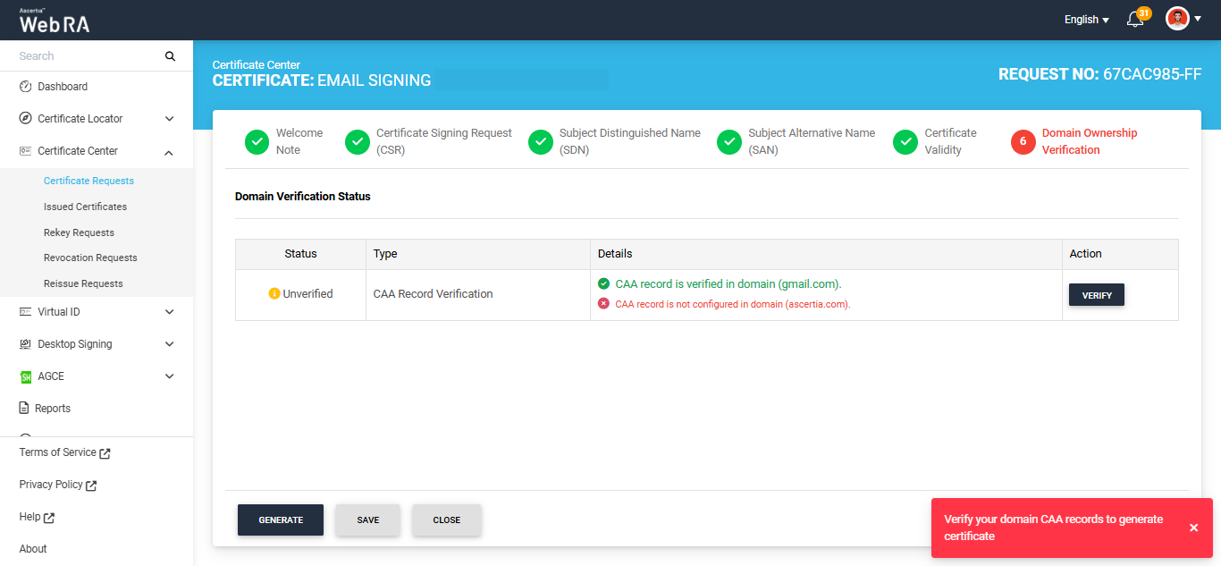 If you attempt to generate the certificate while the Domain Verification Status is ‘Unverified,’ the system will display an error dialog prompting you to verify your domain CAA records before proceeding.