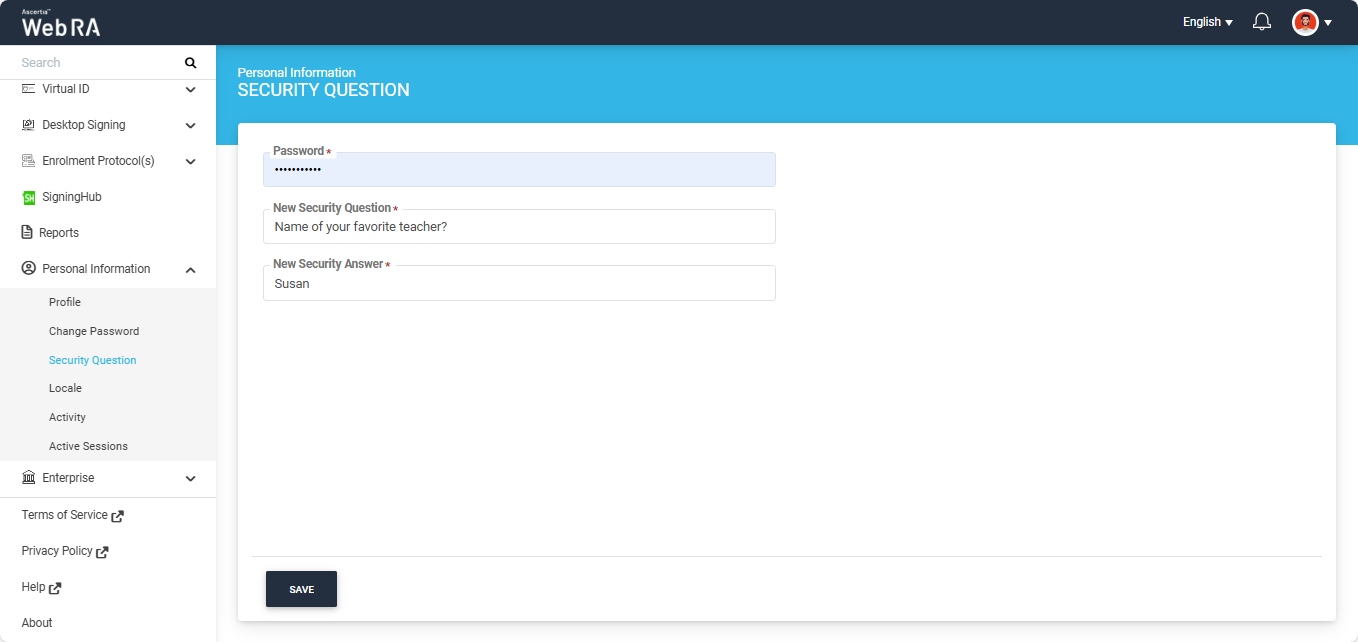 This section allows a user to change the security question that can later be used to reset the password for the ADSS Web portal.