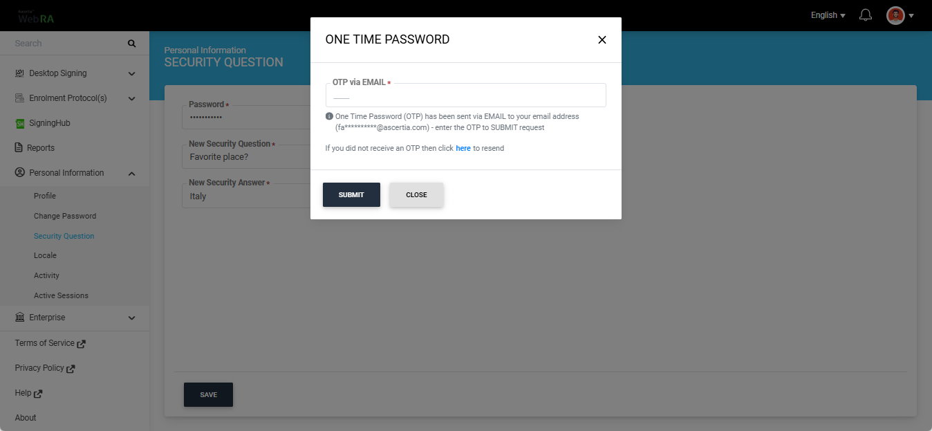 For example: if ‘Email OTP authentication’ is selected as the second factor authentication for the change Security Question action, then after clicking save, the system will ask you to enter the OTP received via email to proceed with the request.