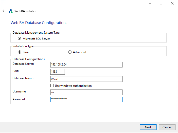 Click the Next button to continue to the database type screen. Select the database type - Microsoft SQL Server or PostgreSQL - that was used in your previous Web RA installation.