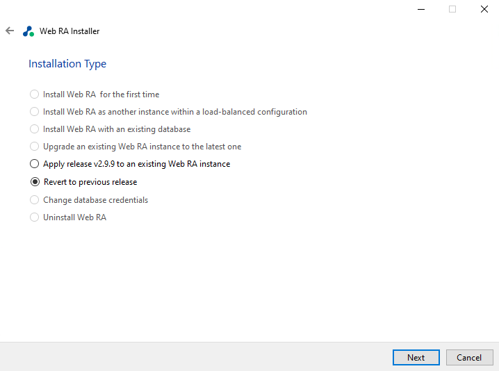 Click the ‘Next’ button to continue to the ‘Installation Type’ screen. Select the “Revert to previous release” option.