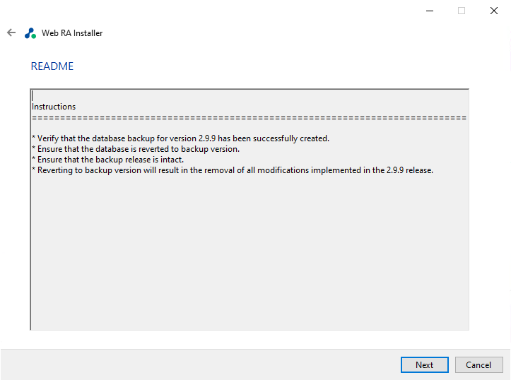 Launch the installer by right-clicking the file name [Web RA Regular Release Installation Directory]/setup/install.bat and select Run as administrator. Follow the installation wizard as described below: