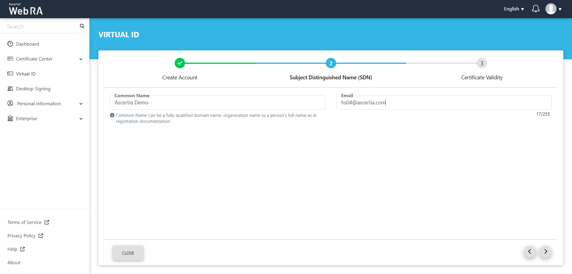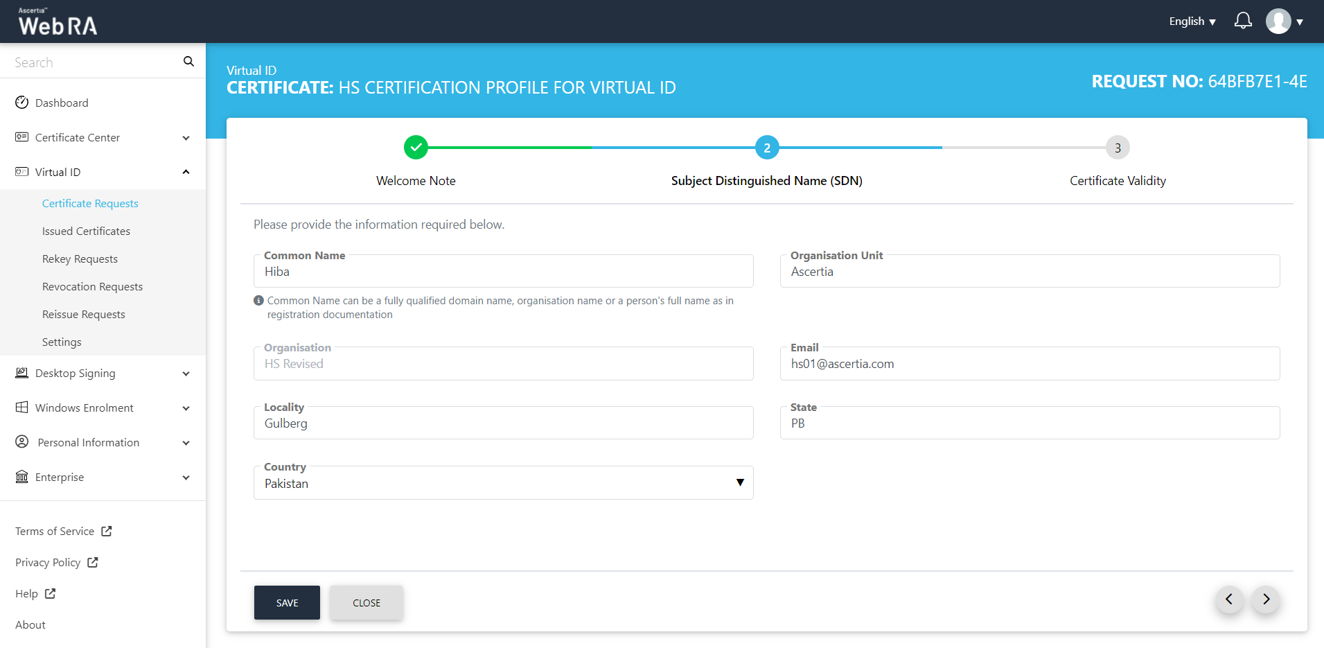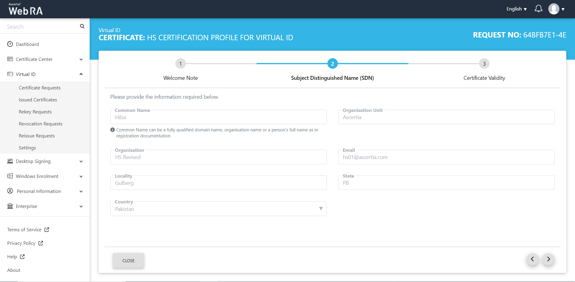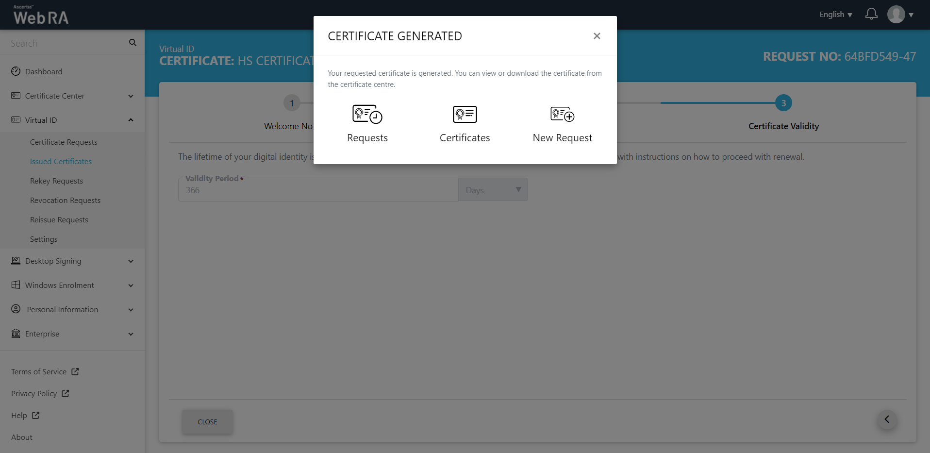 Once you have created a Virtual ID, follow the steps below to create a certificate request: