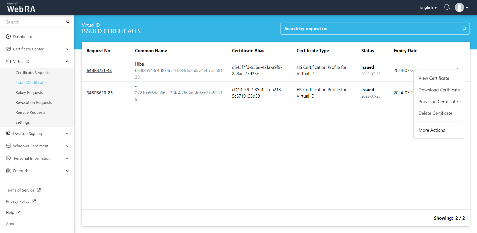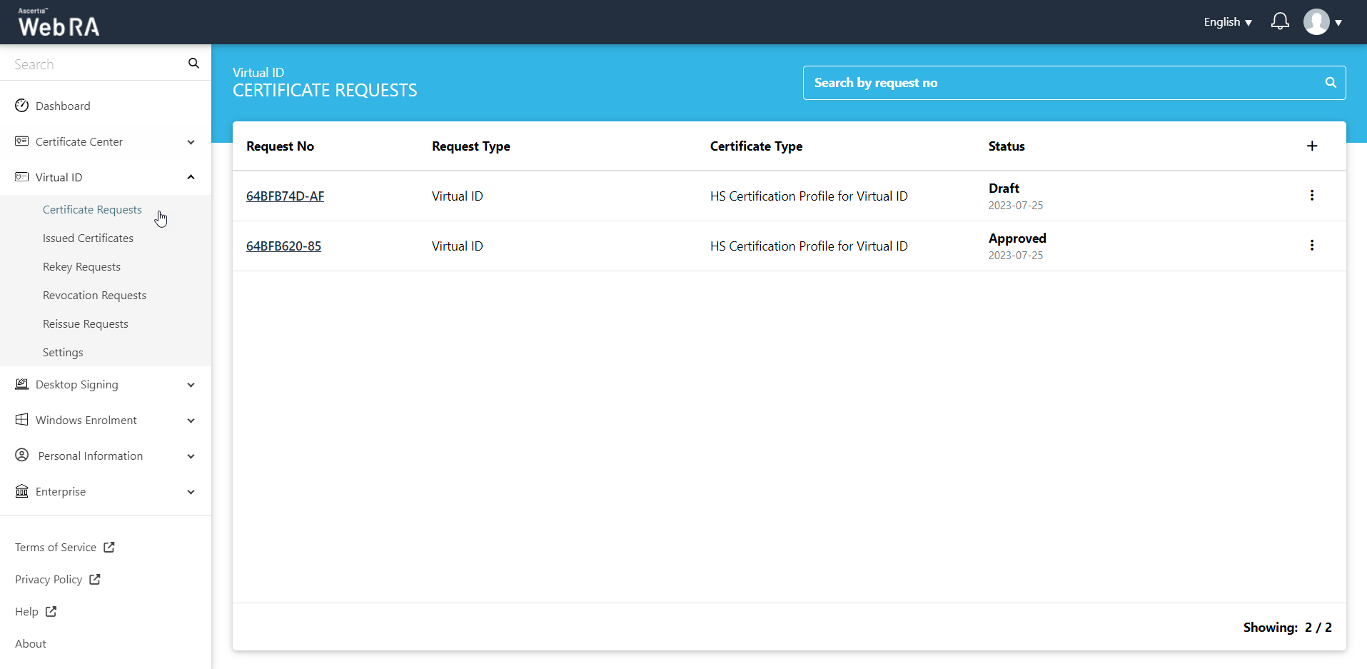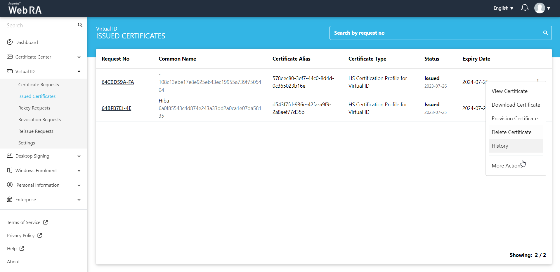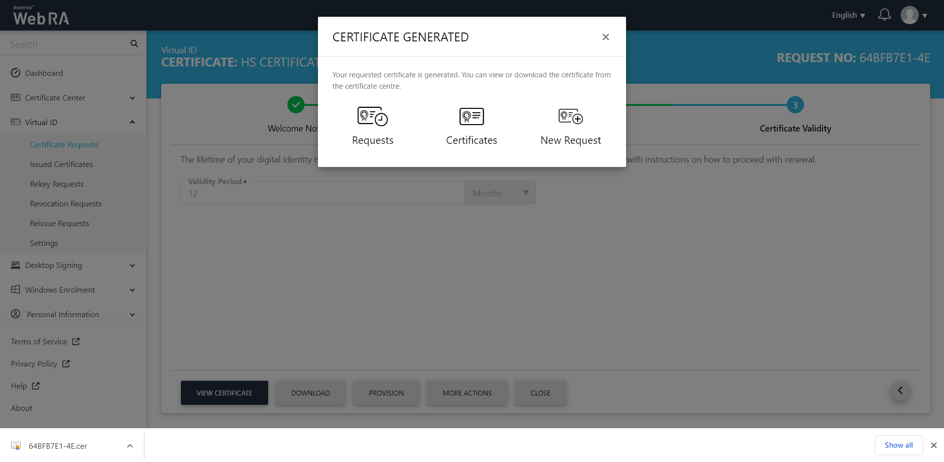 All the certificate requests related to a Virtual ID user will be listed here.