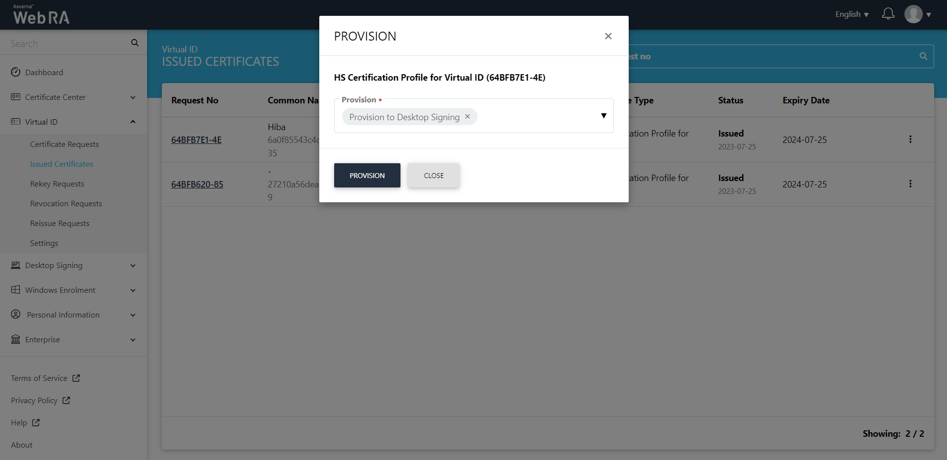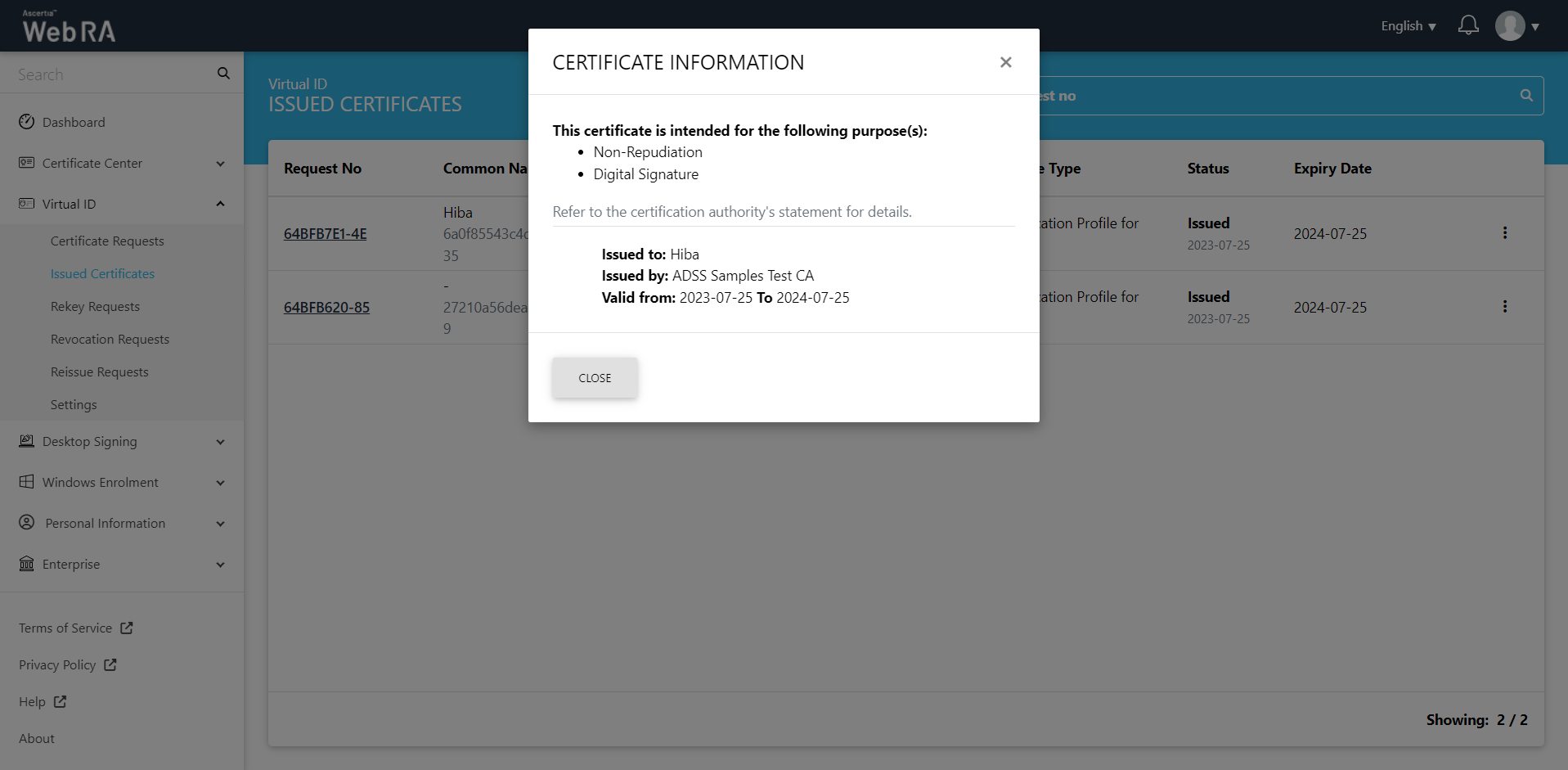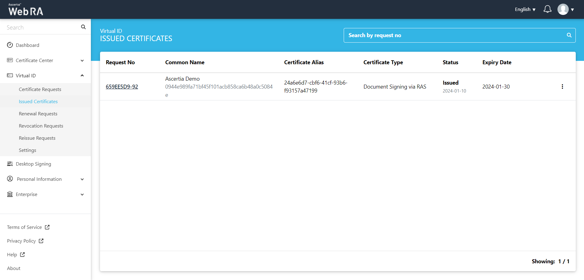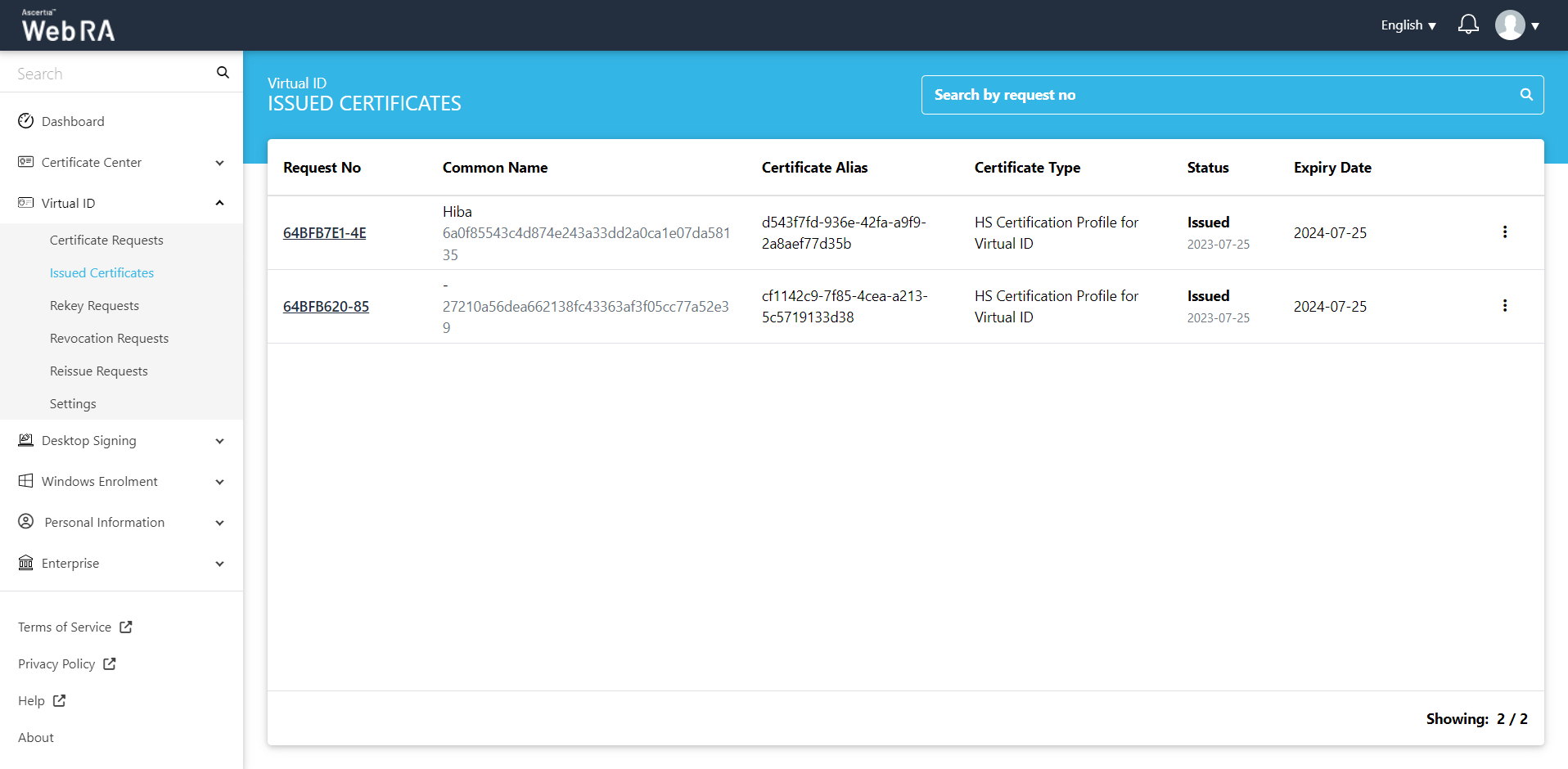 All the certificate requests related to a Virtual ID user will be listed here.