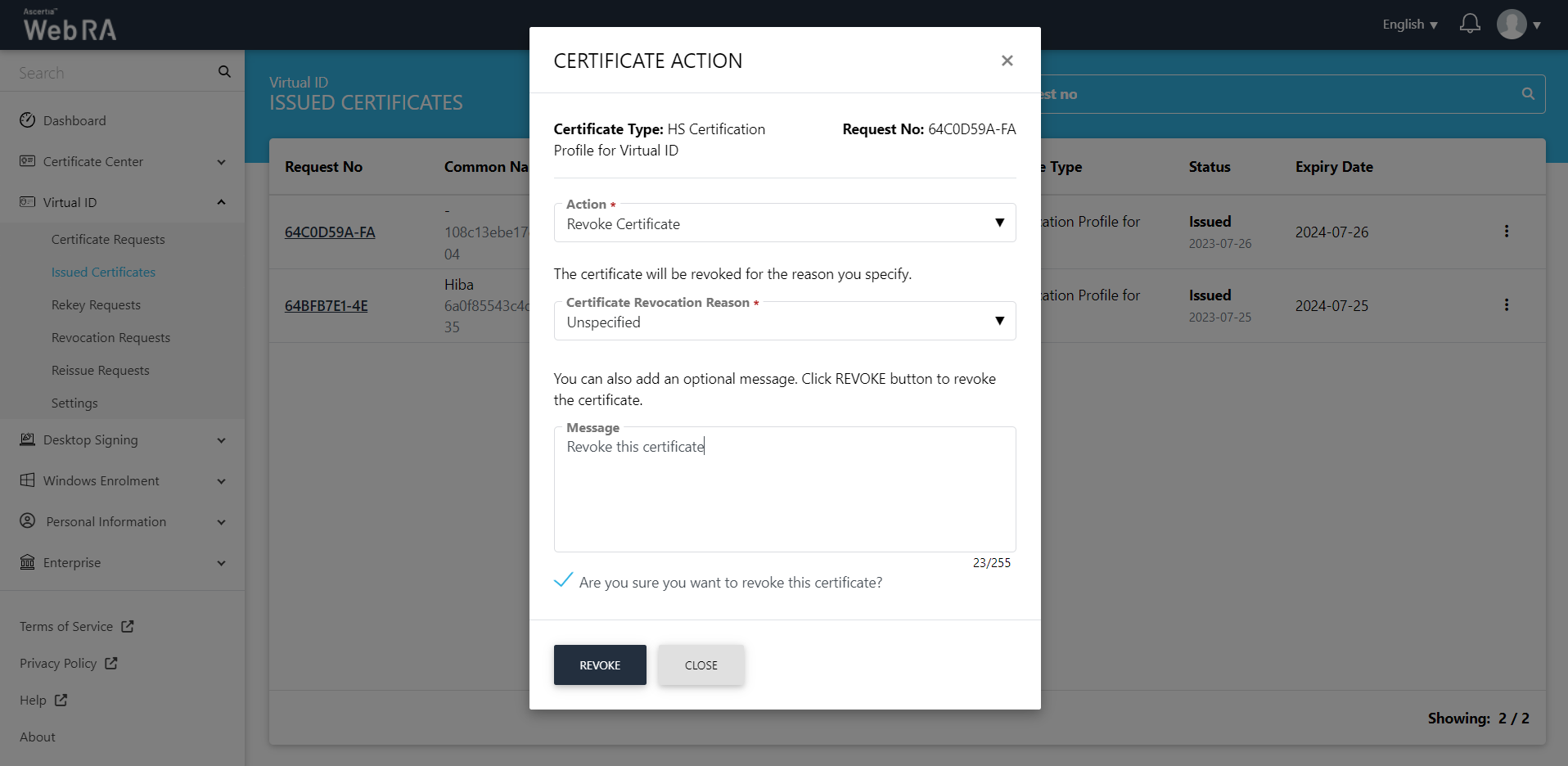 1. Certificate action screen will be displayed. Select Revoke Certificate from the drop down, select a reason for revocation, tick the confirmation checkbox and then click Revoke.