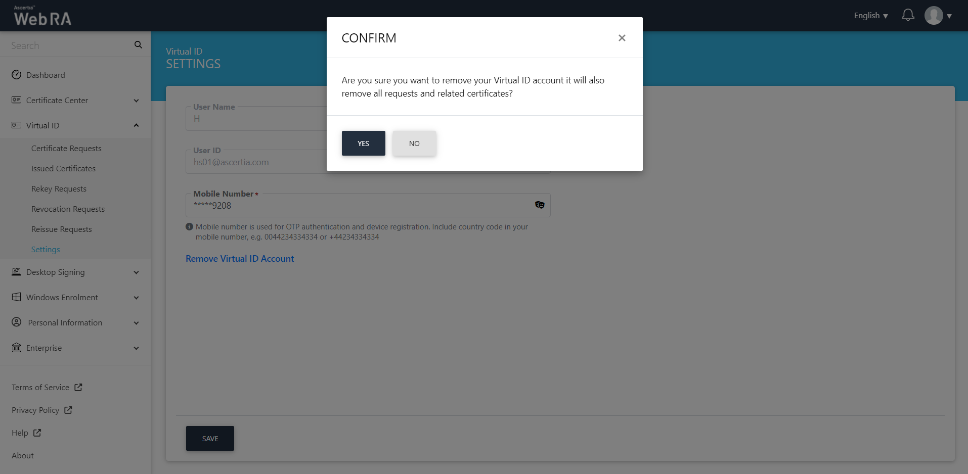 3. A confirmation message will appear. Click Yes to remove your configured Virtual ID account.