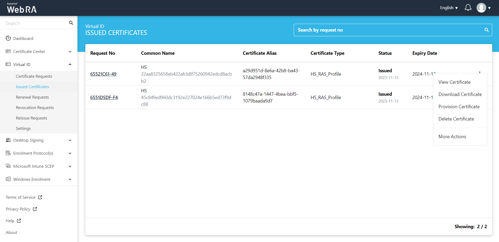 Click More Actions to revoke, rekey, reinstate or renew a certificate as per configured in the admin portal.
