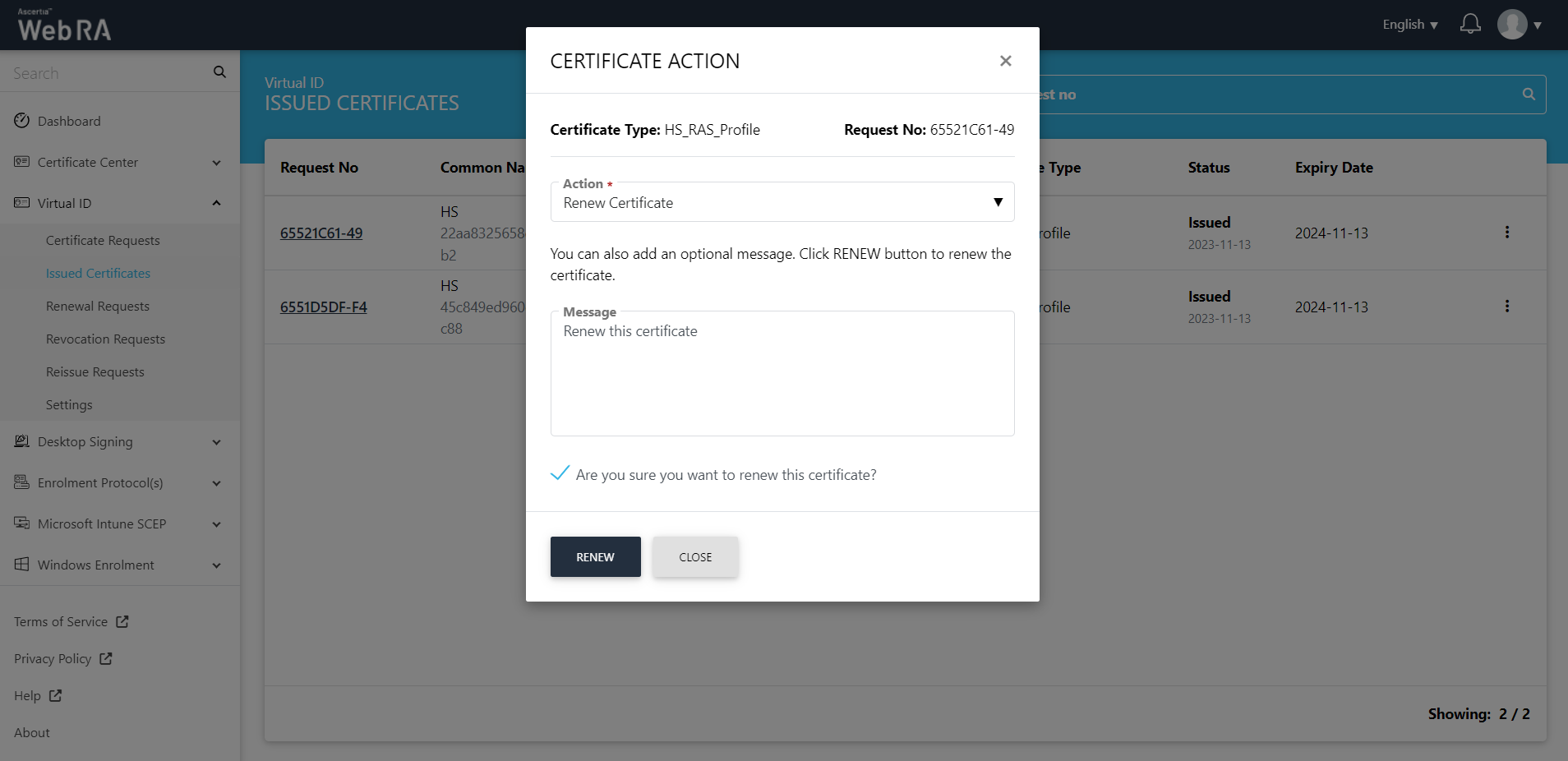 1. Certificate action screen will be displayed. Select Renew Certificate from the drop down, click the confirmation button and then click Renew.