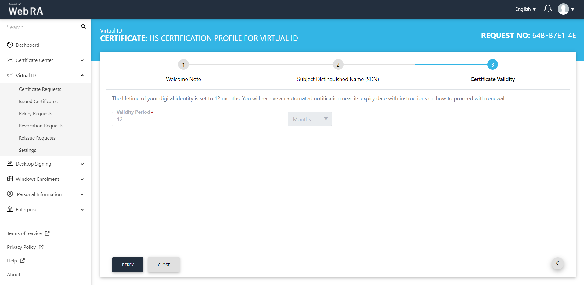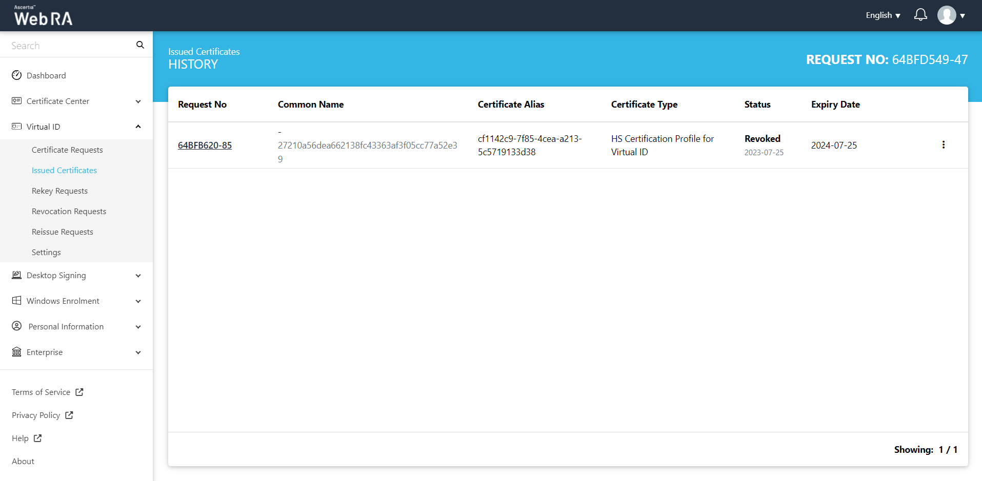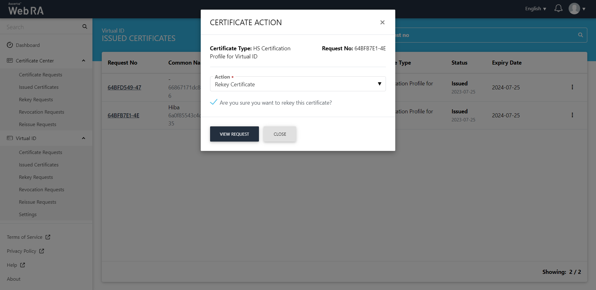 The certificate will appear in the Virtual ID Rekey Requests listing.
