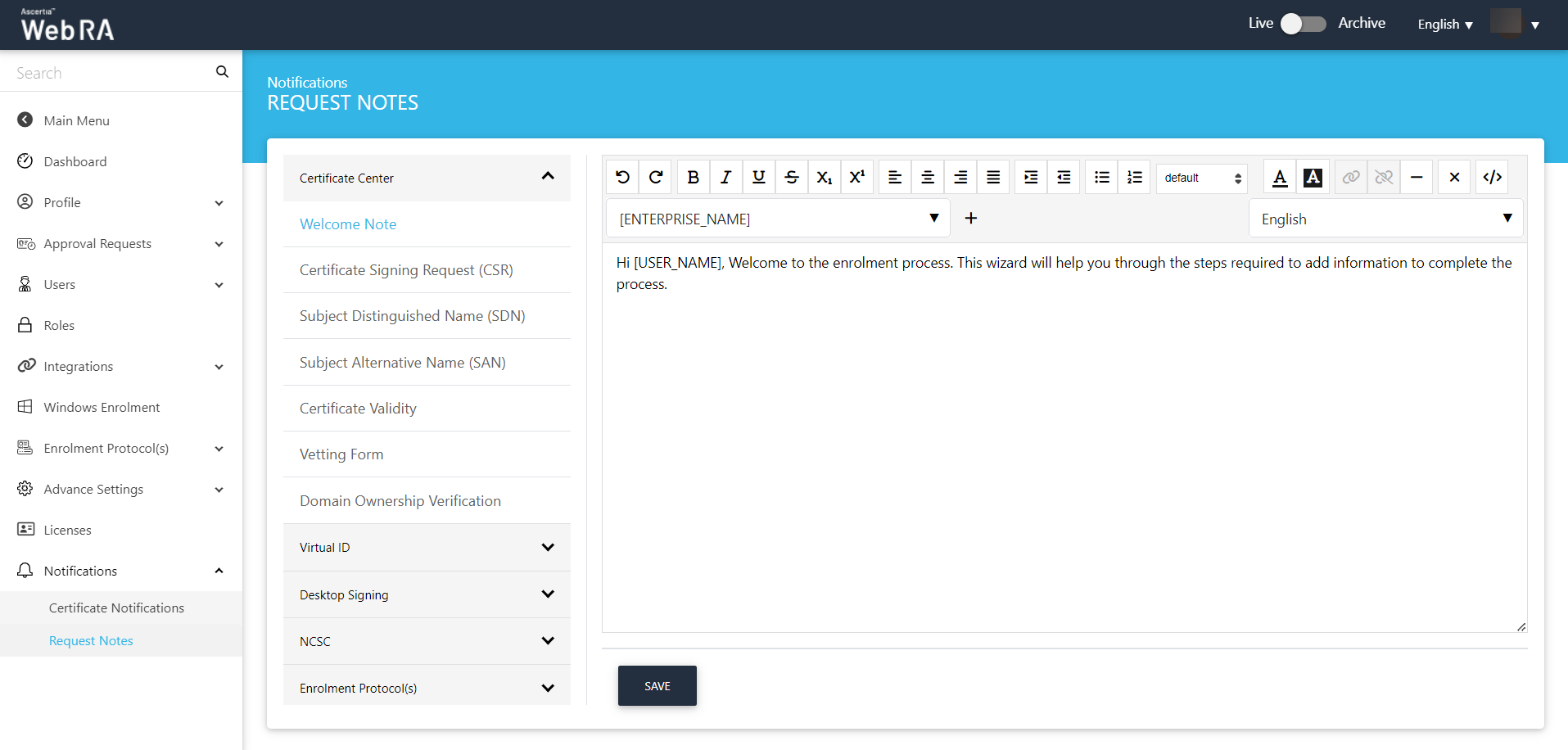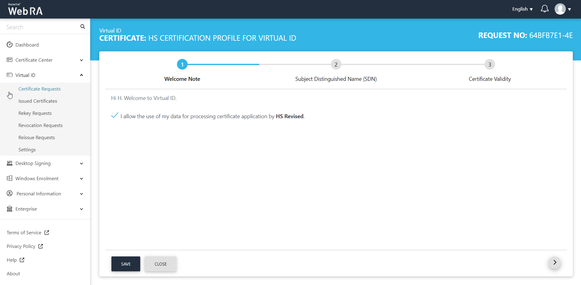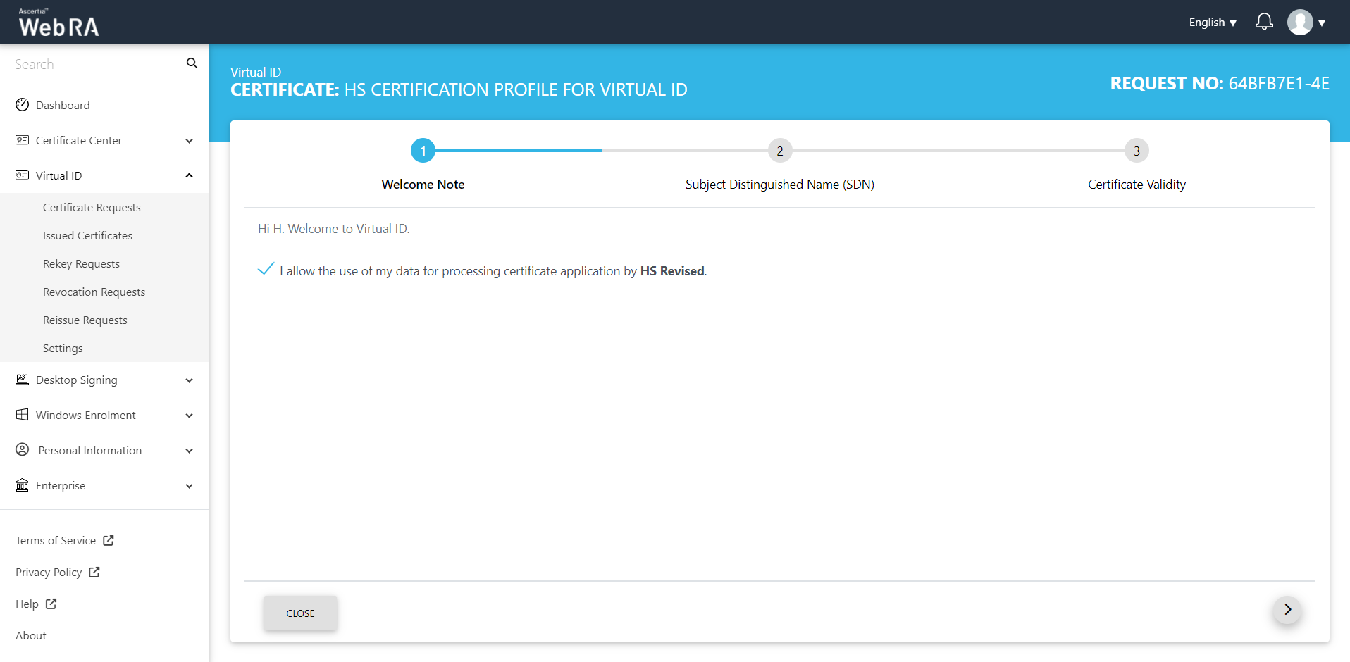 The welcome note will appear, select the checkbox 'I allow the use of my data for processing certificate application by Enterprise Name' and click next. (This screen will appear if operator has customised request notes in the enterprise the user belongs to.)
