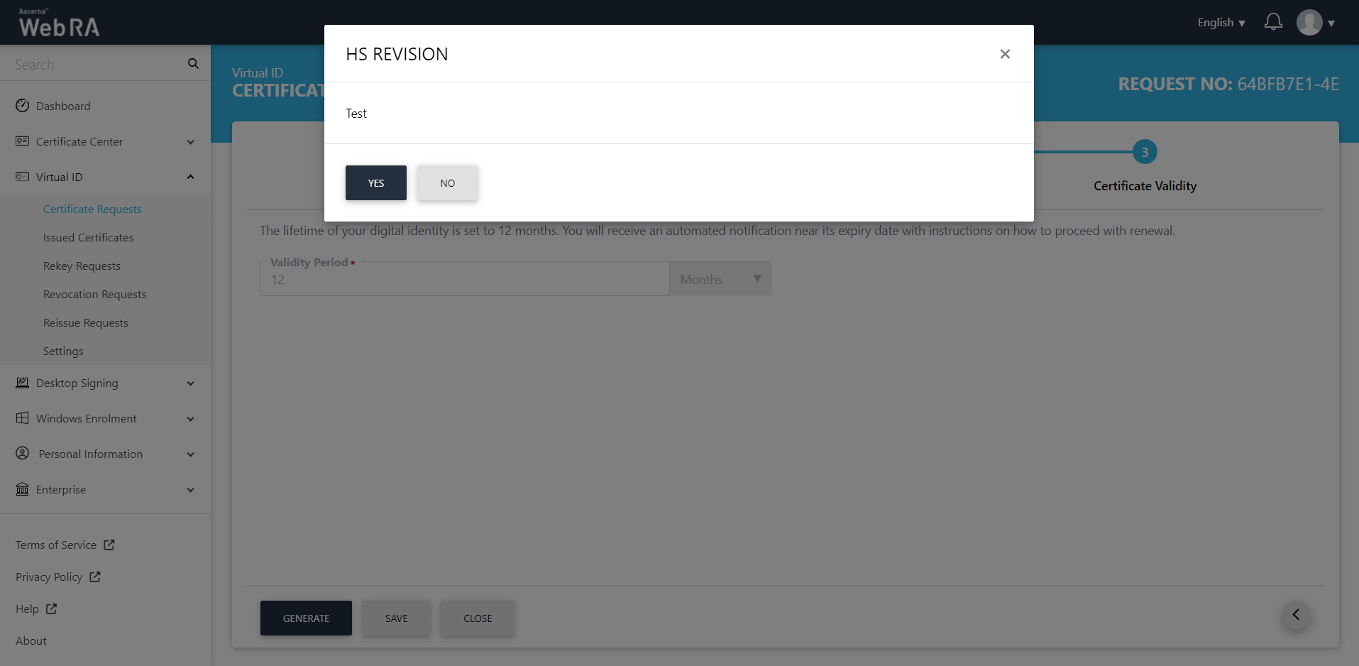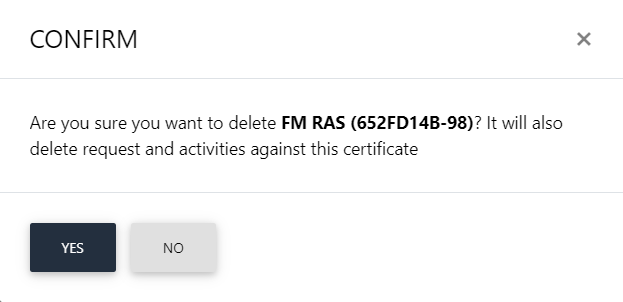 1. A confirmation dialog will appear as displayed below. It will also delete certificate (s) against this request,