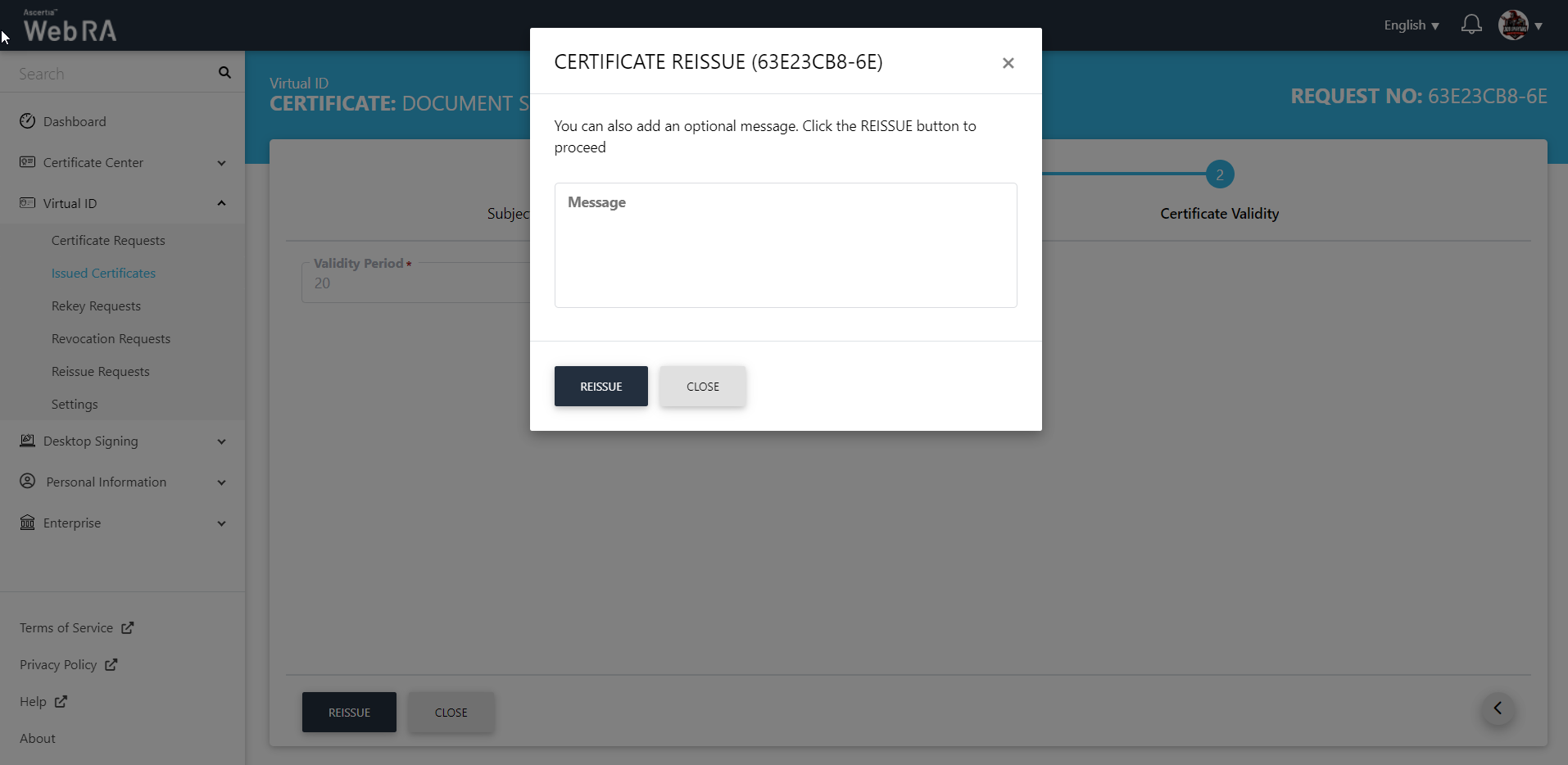 1. You will be navigated to the Certificate Reissue screen. You can add an optional message, and then click Reissue.