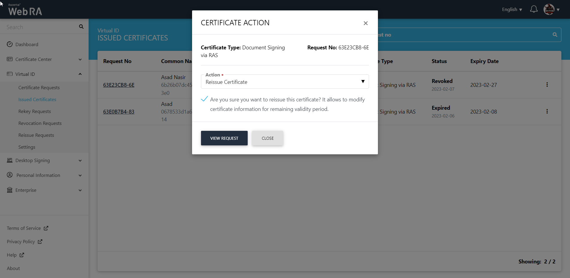 This section lists all the reissue certificate requests pertaining to the Virtual ID user.