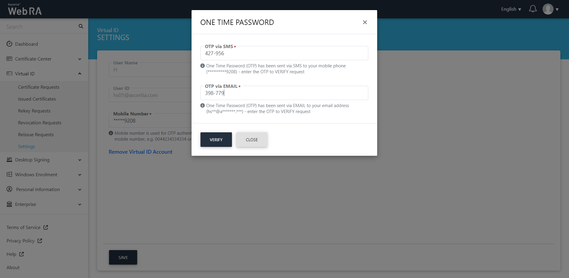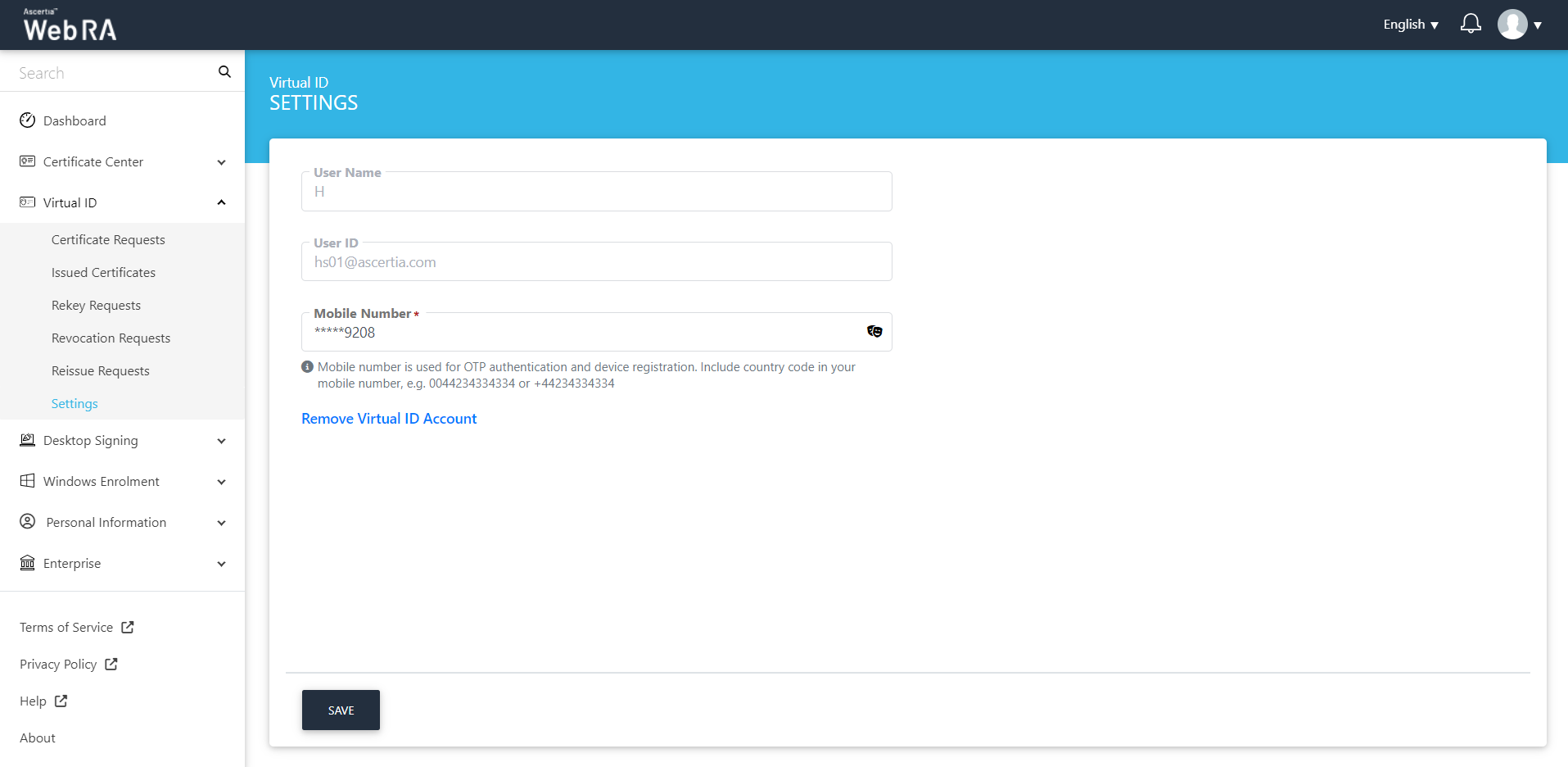 User name is the user that has logged into ADSS Web RA web portal. User ID is the virtual ID user that is registered in the ADSS Web RA. And the mobile number is provided to set up Virtual ID user.