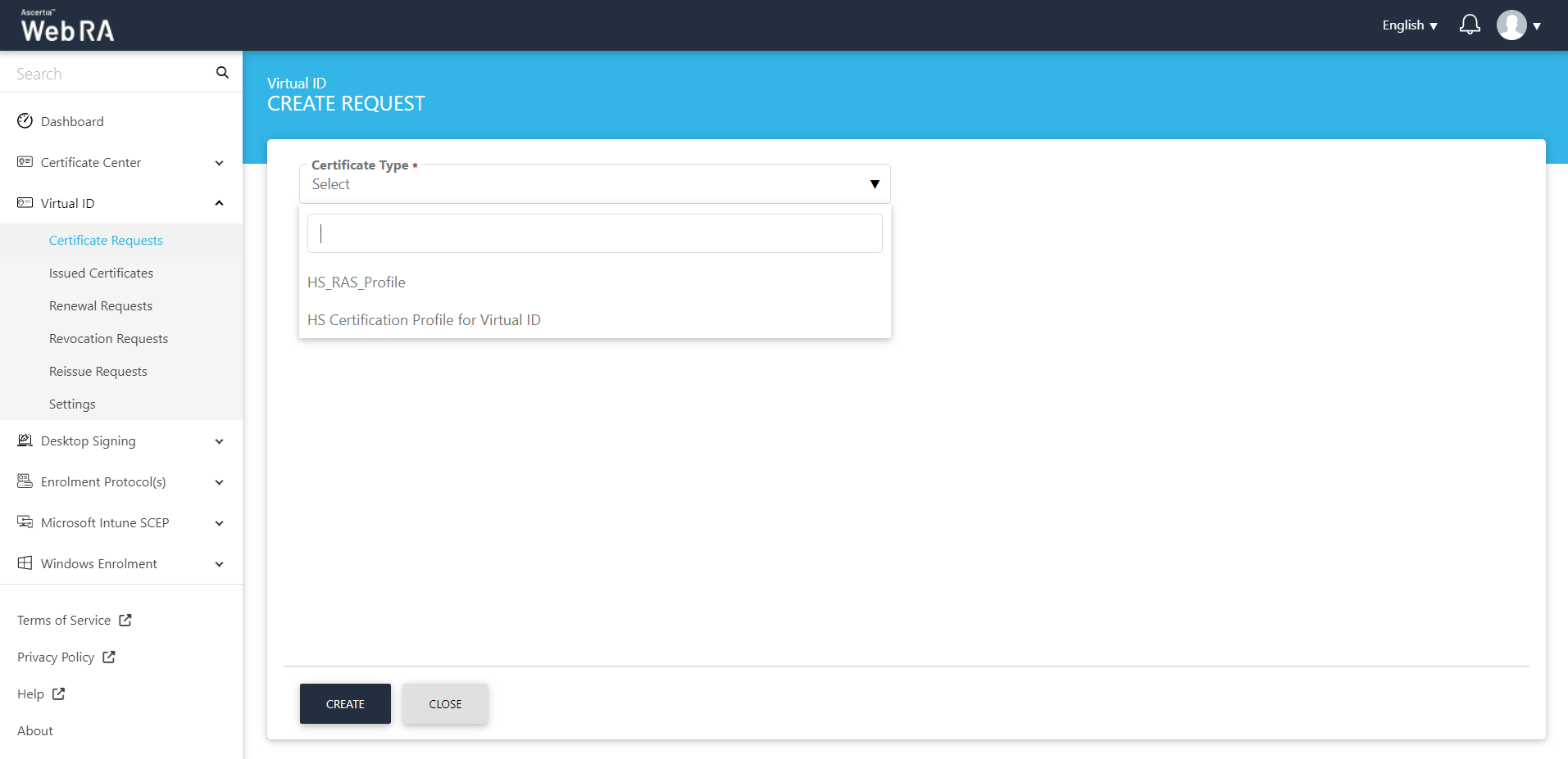 1. The Certificate Type drop down will appear with multiple profiles that are configured in the service plan (admin portal). Select a certification profile from the list and click Create.