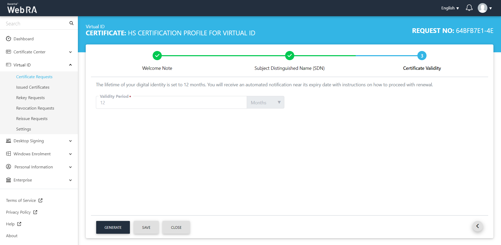 1. The Certificate Validity screen will be displayed. The validity period will appear in a disabled form. Click Generate to proceed.