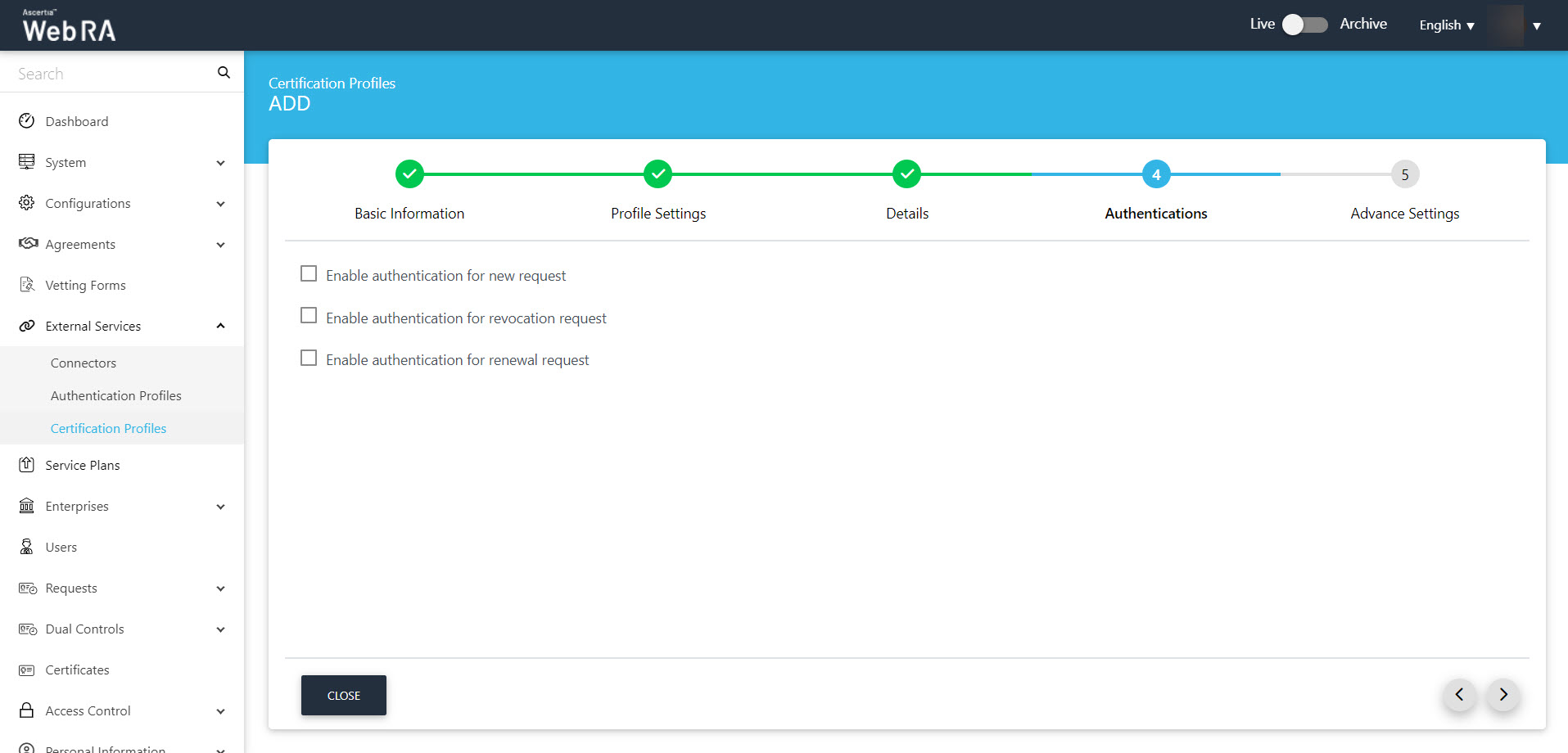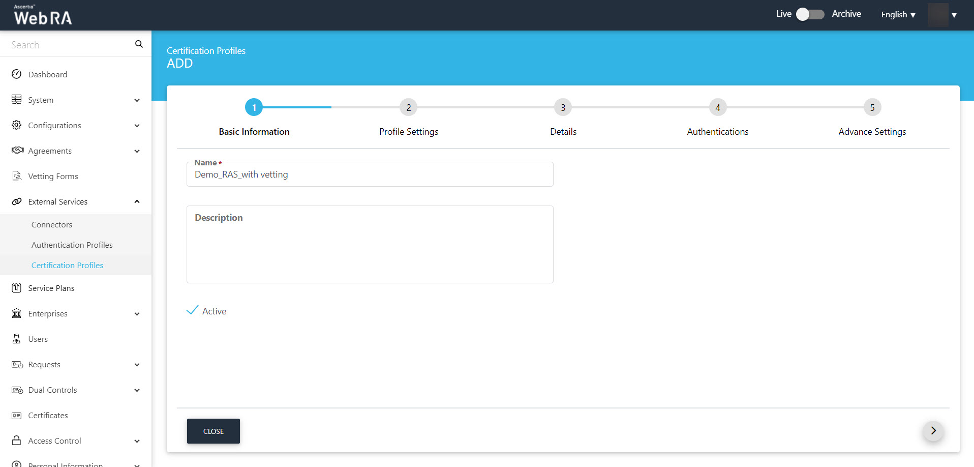 2. A dialog will appear to add the profile details. The certification profile dialog consists of 5 screens, i.e. Basic InformationProfile Settings, DetailsAuthenticationsAdvance Settings