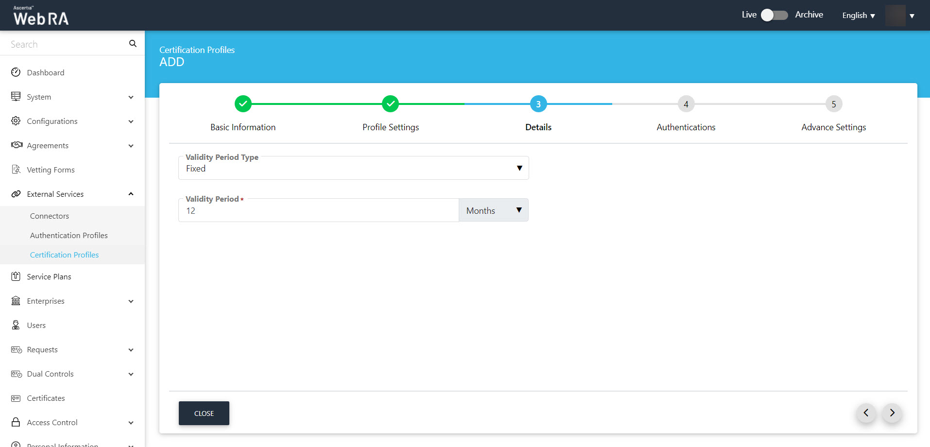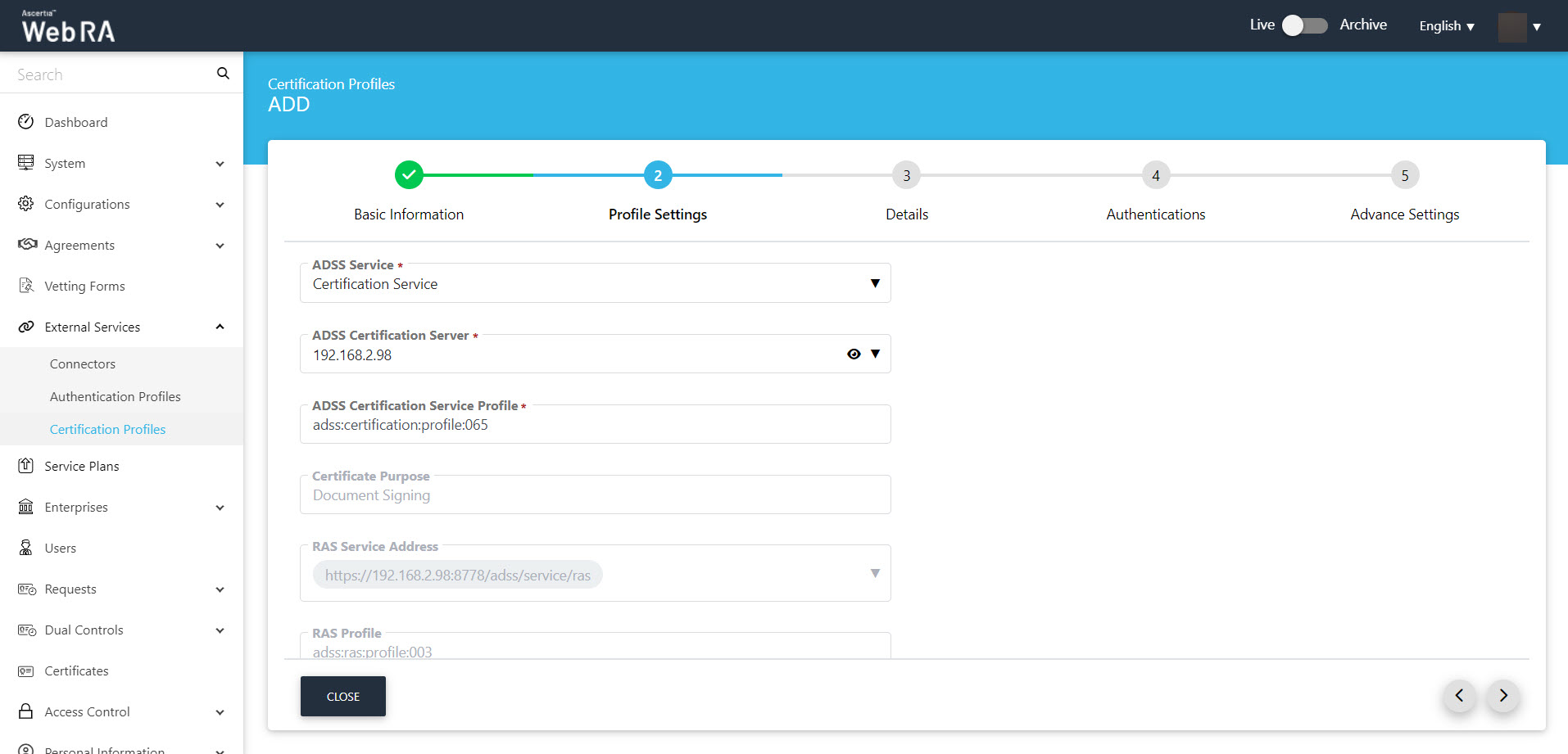 Certification profiles entail all complex configurations and business requirements (i.e. CA details, Key Algorithm, Validity, etc.) to issue corresponding certificates for the ADSS Web RA users.
