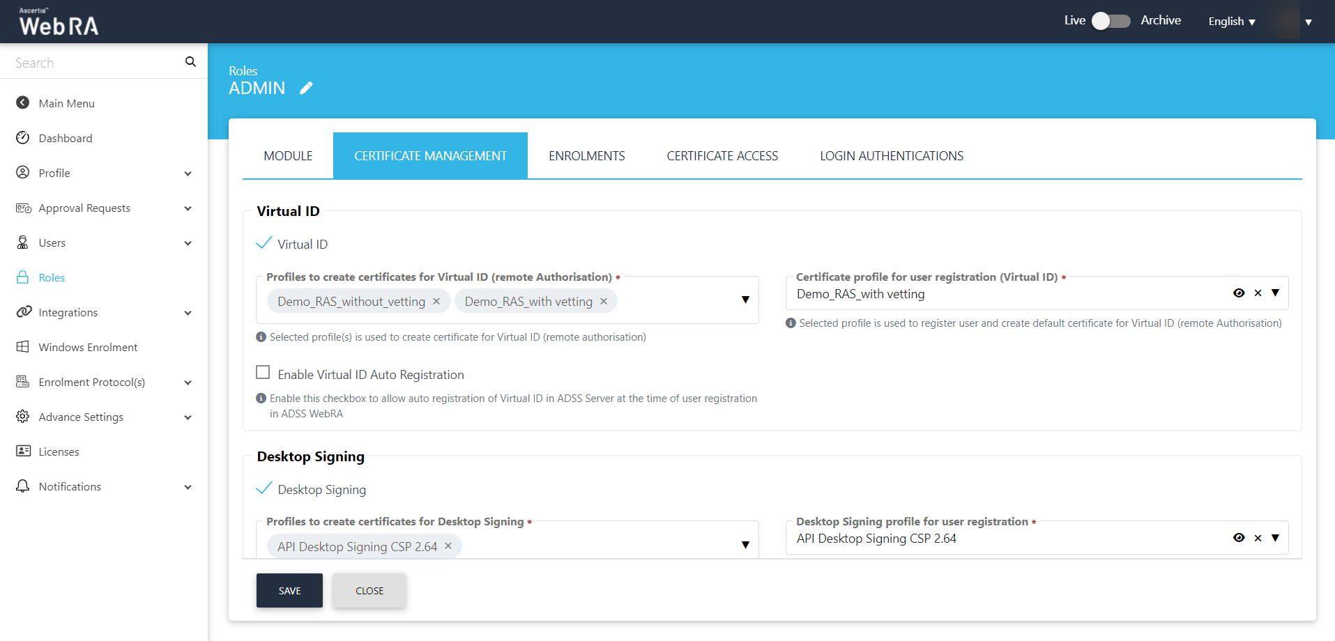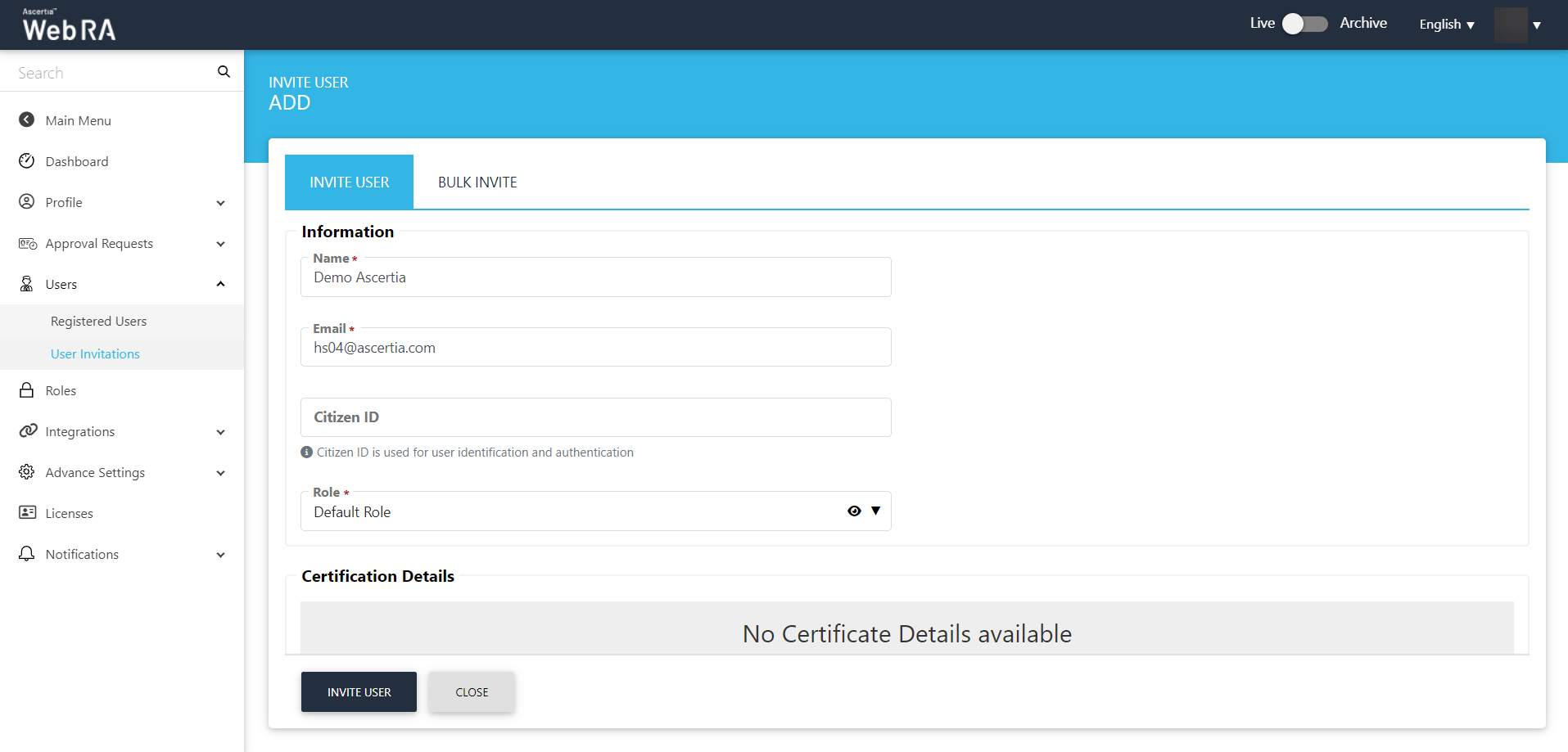 If a certification profile is created without vetting, then a user will be registered in the ADSS Web RA, his virtual ID certificate will be created and provisioned in SigningHub.